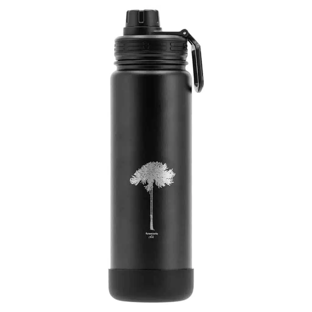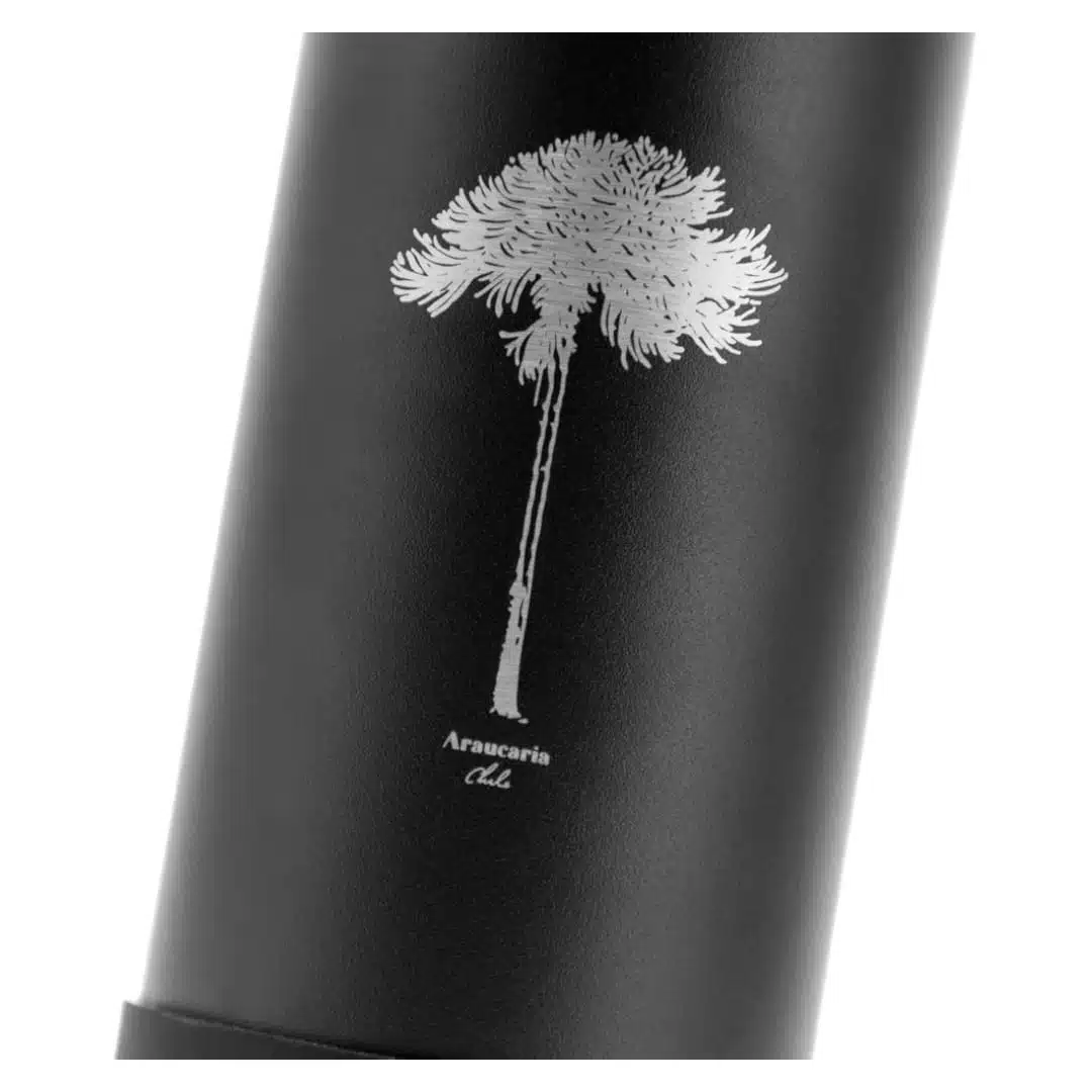 Termo botella inspirada en la Araucaria chilena, con diseño alusivo a este árbol emblemático. Mantiene bebidas a temperatura ideal, combinando funcionalidad y una conexión con la naturaleza de Chile.
