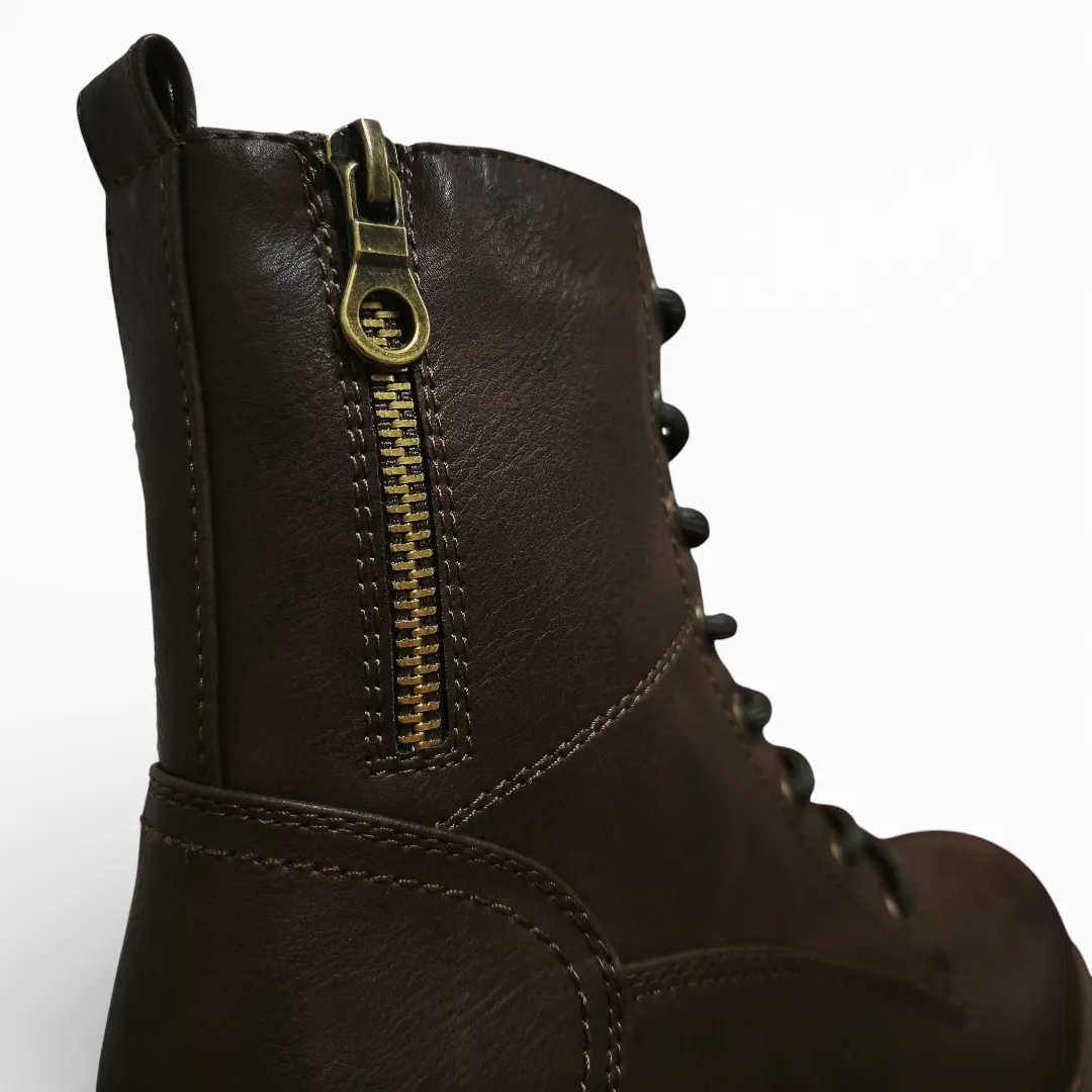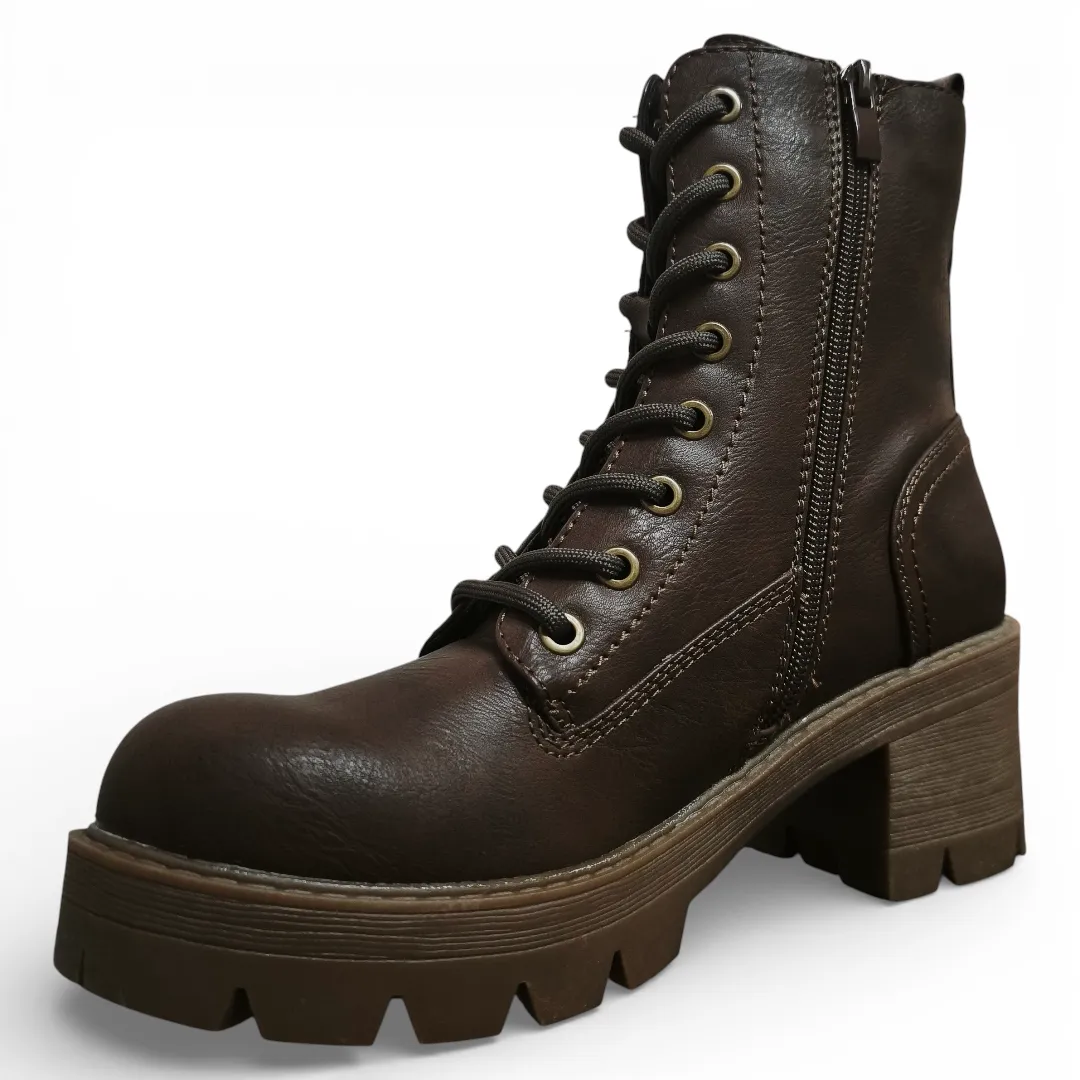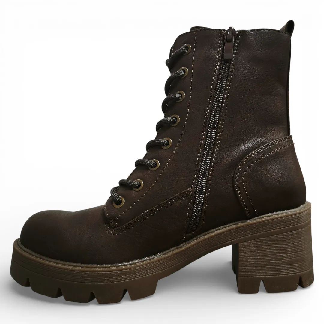 Incorpora cordones frontales y cierre lateral con detalle metálico, facilitando el calce y reforzando su estética tipo combat. Su suela gruesa con diseño dentado entrega mayor estabilidad y una pisada firme.