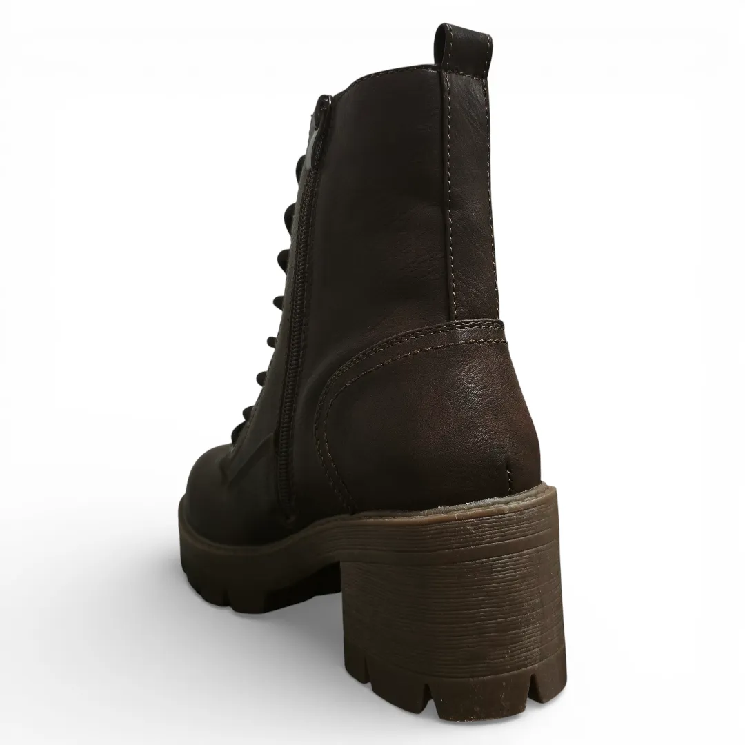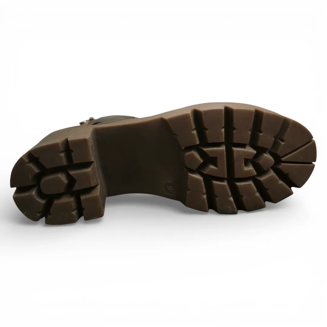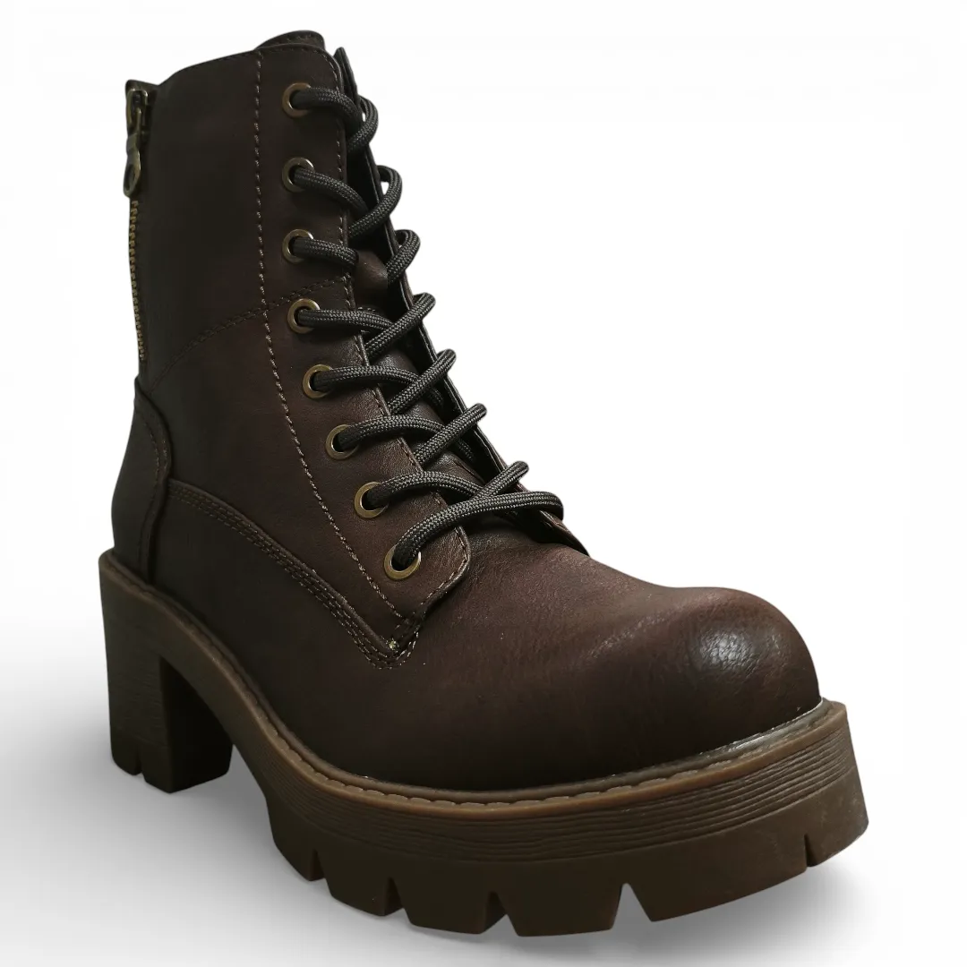 Incorpora cordones frontales y cierre lateral con detalle metálico, facilitando el calce y reforzando su estética tipo combat. Su suela gruesa con diseño dentado entrega mayor estabilidad y una pisada firme.