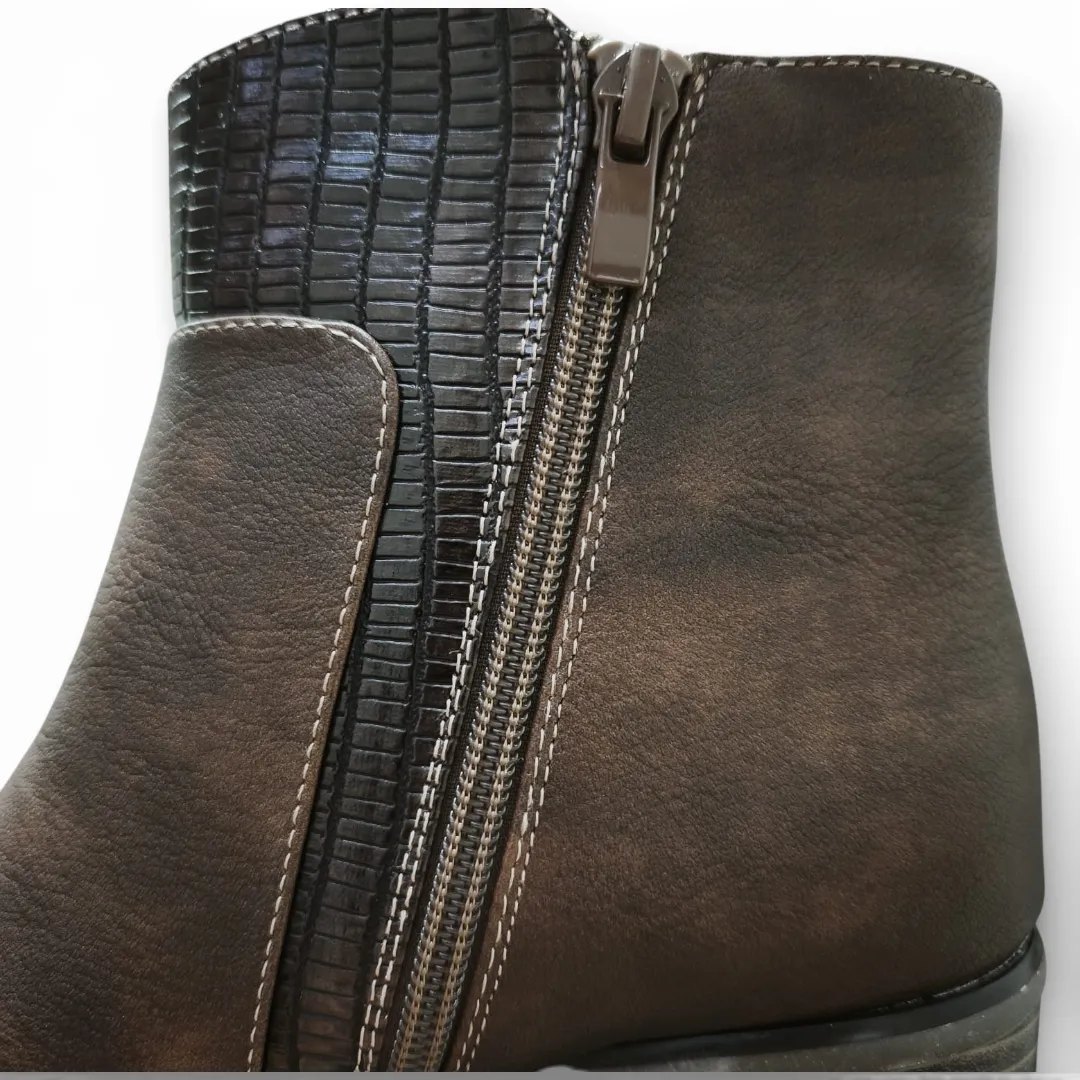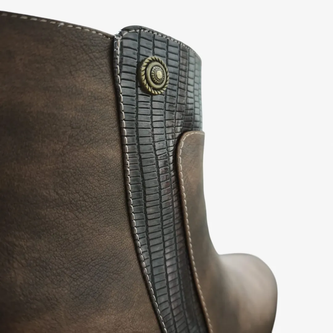 El Botín Mujer Café Bonny Franco combina elegancia y carácter en un diseño versátil ideal para el día a día. Su acabado en tono café con efecto envejecido aporta profundidad y estilo, mientras que el detalle texturizado lateral añade un toque moderno y distintivo.