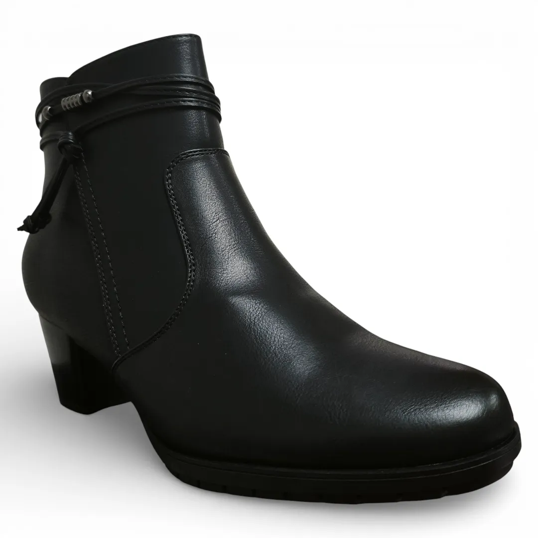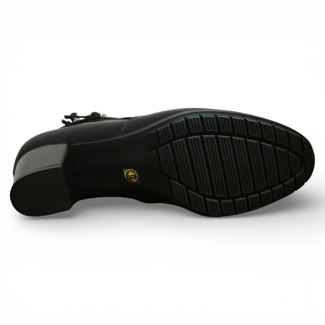 Incorpora un delicado detalle decorativo en el tobillo que aporta un toque sofisticado sin sobrecargar el diseño. Su cierre lateral permite un calce práctico y seguro, mientras que el taco medio entrega estabilidad y confort durante todo el día.