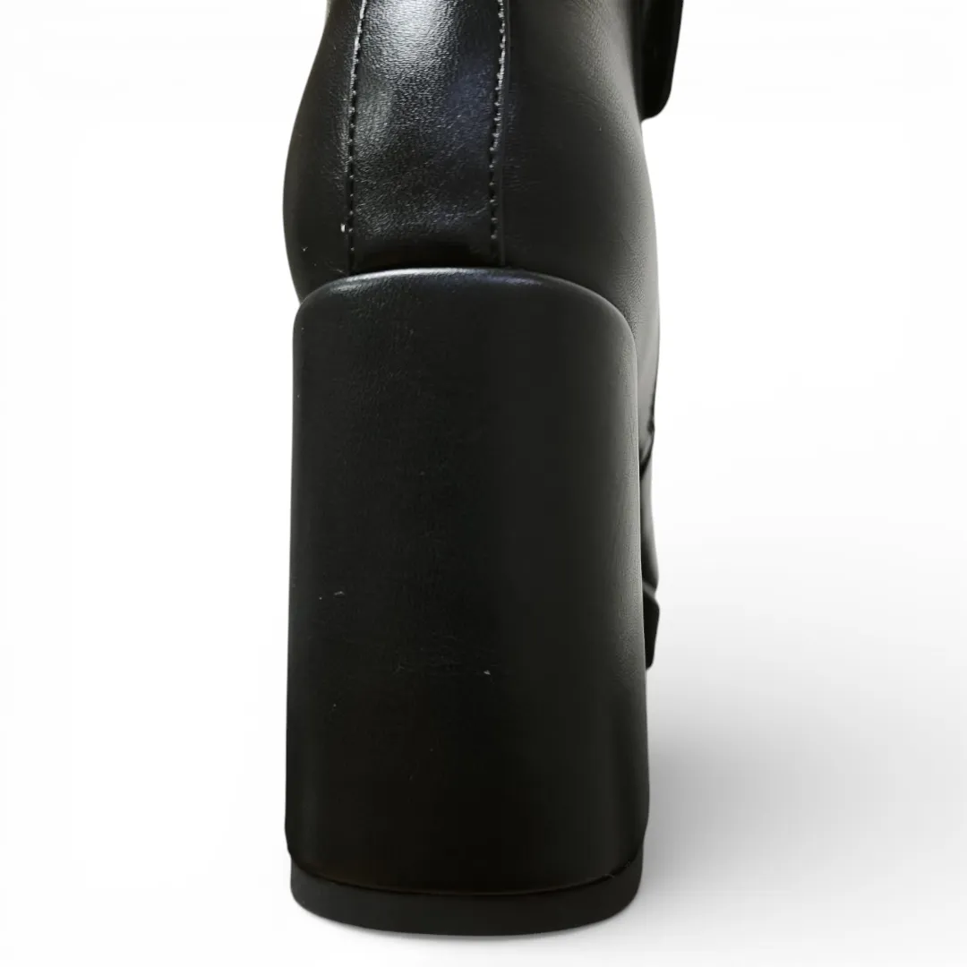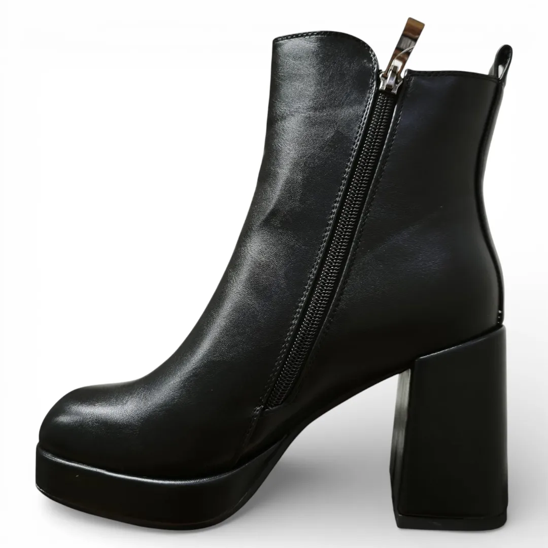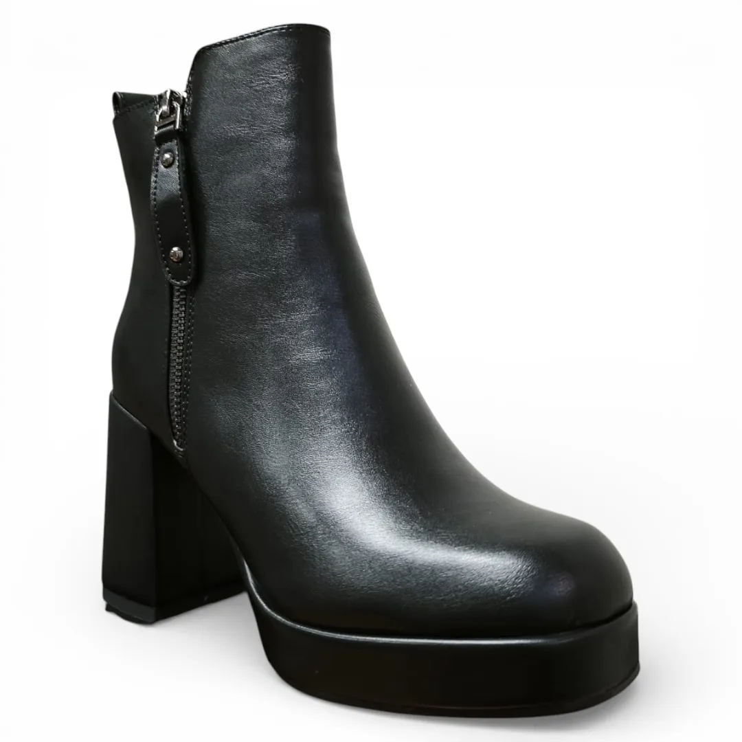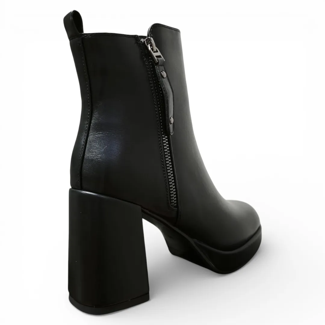 El Botín Mujer Negro Bonny Franco combina elegancia y tendencia en un diseño moderno con plataforma y taco alto ancho que estiliza la silueta y aporta carácter a cualquier look.