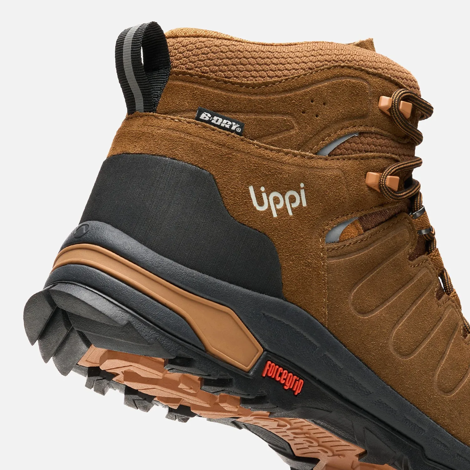 · Botin hiking · Capellada de cuero Cow Suede hidrofugado y malla de nailon resistente a la abrasión · Refuerzos de goma en talón y puntera · Forro membrana B·Dry impermeable · Suela Forcegrip de goma de gran agarre · Entresuela de EVA y pieza de TPU para mayor soporte · Plantilla Ortholite de espuma antibacterial · Pasacordones de cinta y ganchos de ajuste rápido en la parte superior · Detalles reflectantes