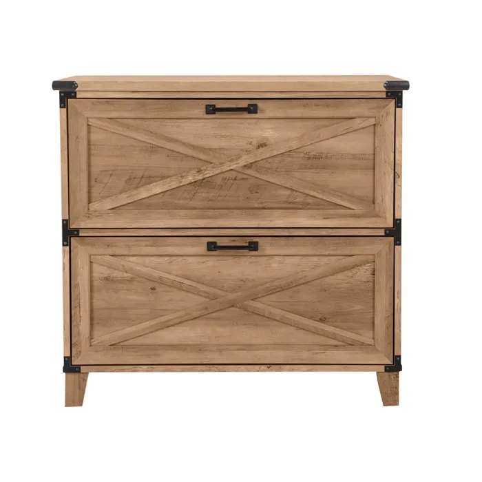 Aumenta el encanto de tu espacio de trabajo doméstico con este archivador lateral de dos cajones. Cumple con la promesa de un amplio almacenamiento de documentos, que se adapta tanto al tamaño de las letras como al tamaño del papel legal. Cada cajón unidad con deslizamientos suaves del rodillo y extensión completa para un fácil acceso a todo lo que se mantiene dentro. Una presentación elegante incluye un acabado de grano de madera de roble rústico con mucha variación natural, reforzando su carácter casual. El detalle del soporte de metal con acabado negro agrega un toque de acabado perfecto y dimensional. Incluye: Un (1) cajón lateral para archivos Materiales: 88% PB, 10% MDF, 2% metal Acabado: Roble rústico El estilo casual se adapta a los espacios de oficina del hogar o de negocios casuales. El acabado de roble rústico añade un aspecto natural. Los acentos de metal negro incluyen tirantes de esquina y hardware. X-bars decorativos en cajones. Contiene documentos legales y tamaño carta. La barra colgante interior soporta archivos colgantes. Cajones totalmente extensibles Rasguños y abolladuras resistentes Posee documentos legales y tamaño carta Soporte y remache de metal Colgador de archivos El aspecto relajado de la granja agrega un atractivo casual al hogar y a las oficinas profesionales Añade un ambiente orgánico y natural con un acabado de madera de roble rústico Detalles de granero en X-cross en dos frentes de cajón Acomoda carpetas de archivos colgantes para facilitar el acceso a todos sus documentos Las superficies laminadas son resistentes a arañazos, abolladuras y otros desgastes.