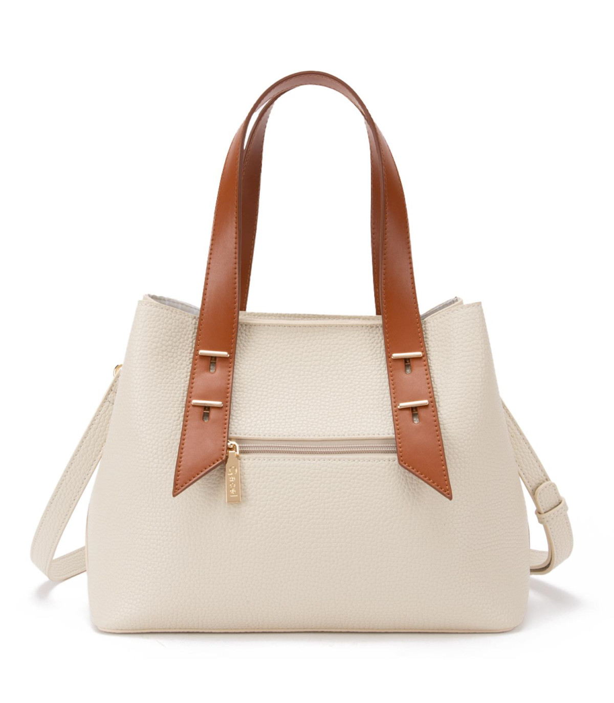 Su diseño incorpora asas bicolor en tono camel, aportando contraste y sofisticación, junto con una correa desmontable y ajustable que permite llevarla al hombro o cruzada.