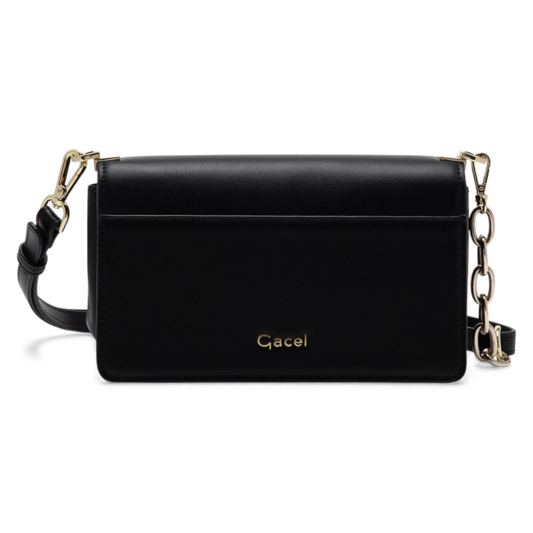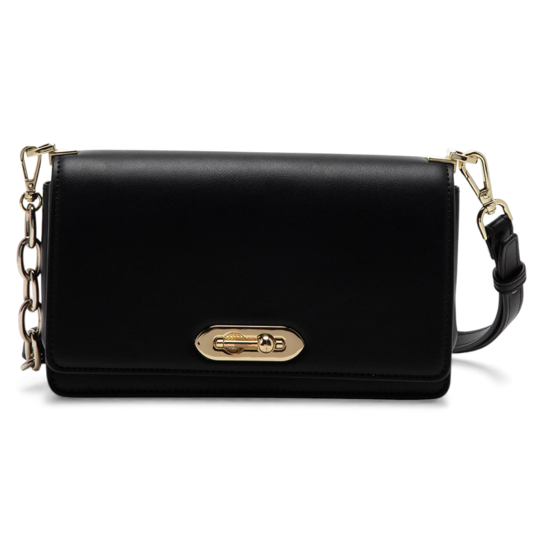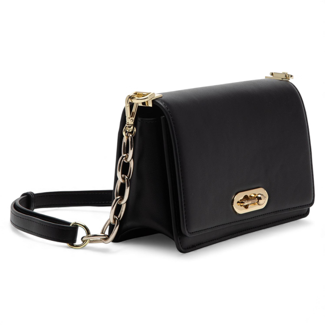 Fabricada en cuero sintético negro de acabado liso, combina estilo clásico con toques modernos gracias a su cadena metálica dorada y su broche frontal decorativo, que le aportan distinción y feminidad.