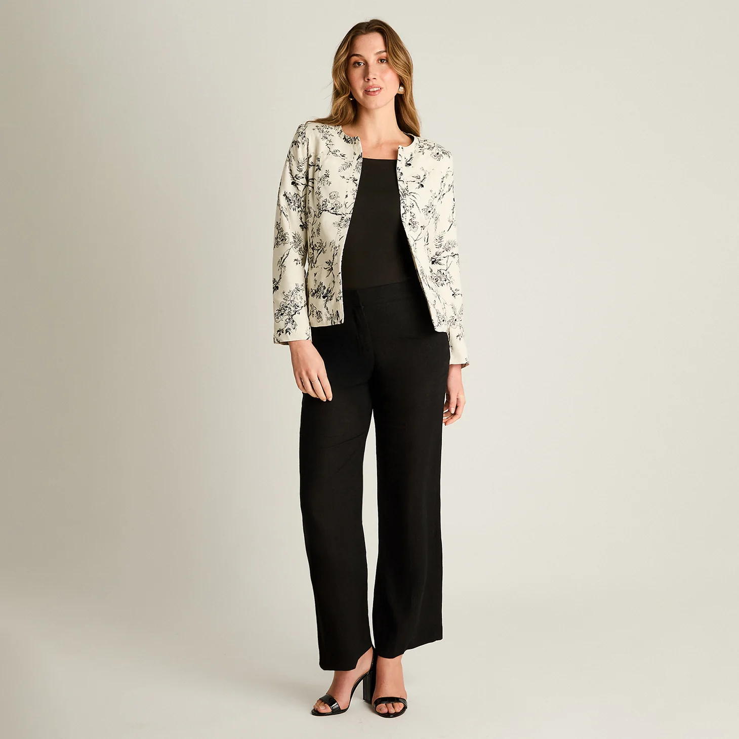 Esta casaca negra con estampado floral es la elección perfecta para dar un toque sofisticado a tus looks de oficina. Su confección en lino y viscosa aporta una textura liviana y respirable, ideal para los días más cálidos. El diseño entallado con cierre central, bolsillos diagonales y delicados detalles en las costuras frontales estiliza la figura sin perder comodidad.