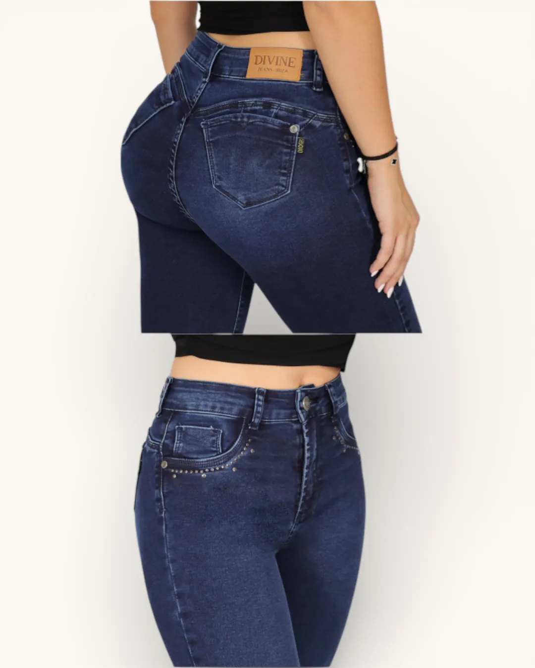 El Jeans Ferrari Flare Blue Galaxy de Divine combina calce ajustado en cadera y muslos con una elegante apertura flare desde la rodilla, estilizando la figura y aportando un look moderno y femenino.