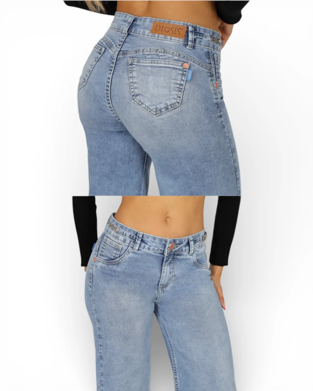El Jeans Grecia Light Blue de Divine destaca por su diseño wide leg y tiro alto, ideal para crear un look moderno, cómodo y estilizado. Su corte de pierna ancha aporta una caída elegante que alarga visualmente las piernas, mientras define la cintura y realza la silueta de forma natural.