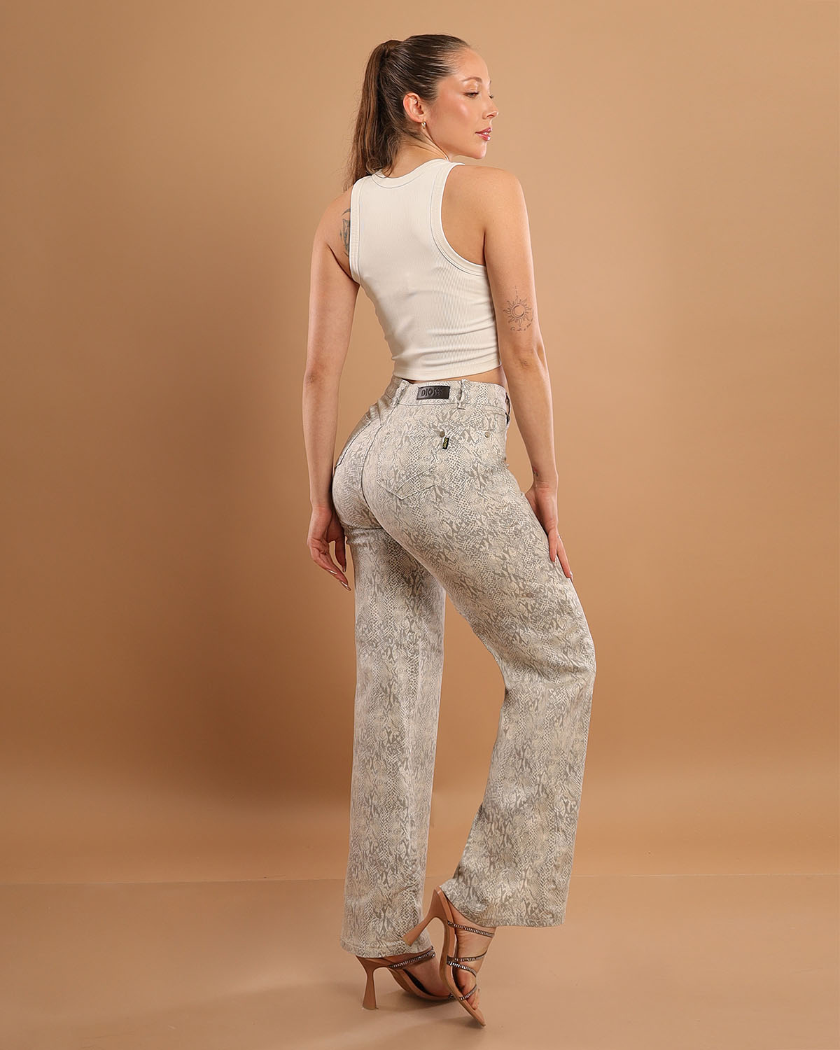 El Jeans Giulia Pitón de Divine Jeans Ibiza es sinónimo de actitud y estilo. Con un estampado inspirado en la piel de serpiente, este diseño wide leg combina elegancia, comodidad y personalidad. Su corte de tiro alto estiliza la figura, mientras que la silueta amplia ofrece un look fluido y moderno. Perfecto para mujeres seguras, que buscan destacar con una prenda única y sofisticada.