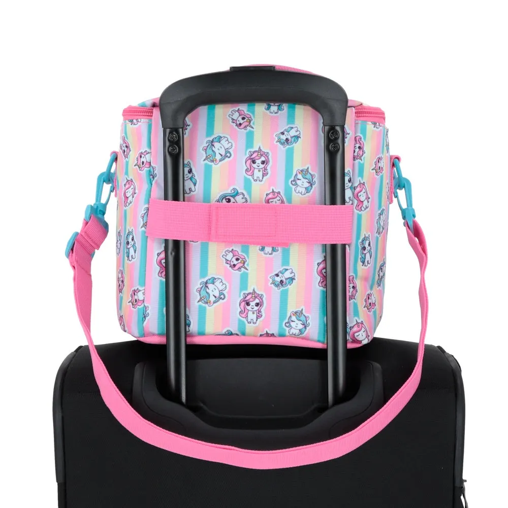 Fabricada en poliéster de alta resistencia, cuenta con banda para carro, correa ajustable y correa desmontable, permitiendo un transporte cómodo y versátil junto a mochilas escolares. Una opción liviana, fácil de limpiar y pensada para niños y niñas.