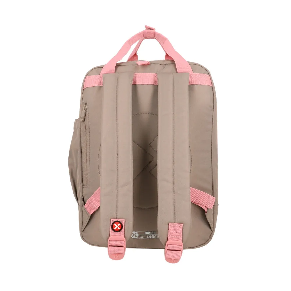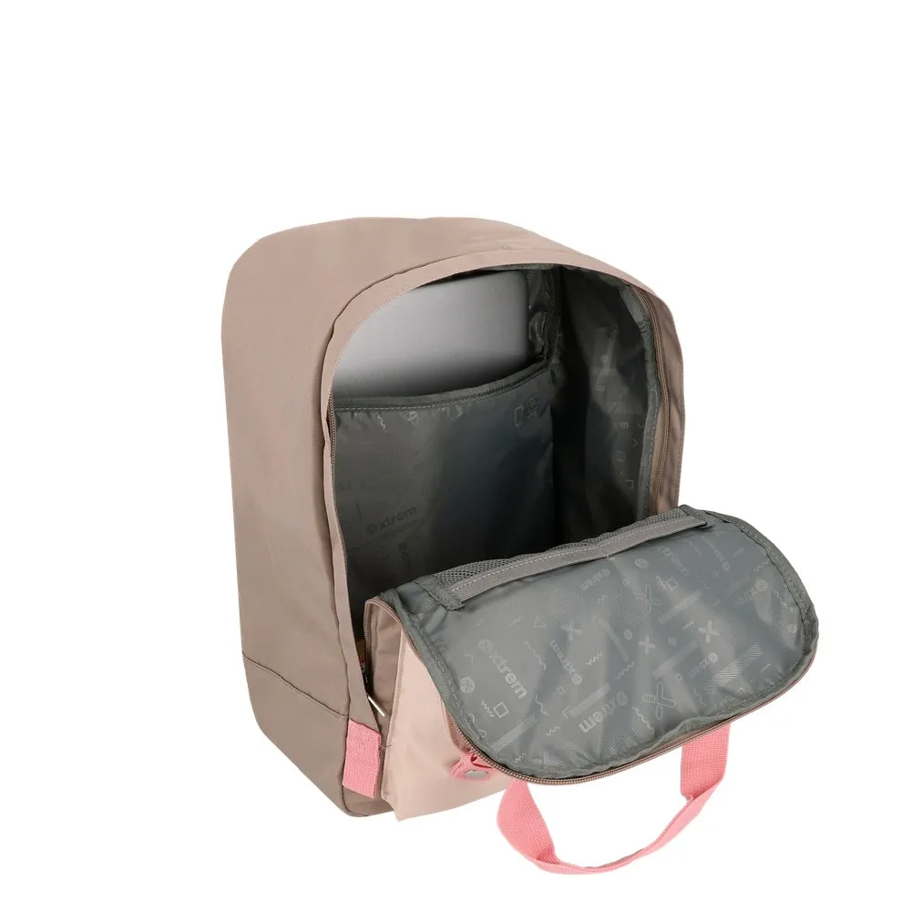 La mochila Xtrem Monroe rosada-beige combina un diseño moderno y femenino con la funcionalidad ideal para el día a día. Su capacidad de 23 litros la hace perfecta para uso urbano, universitario o laboral, permitiendo transportar cómodamente un notebook y accesorios esenciales.