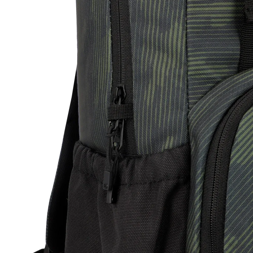 Cuenta con una capacidad de 35 litros, un compartimento acolchado para notebooks de hasta 16 pulgadas y múltiples bolsillos que facilitan la organización. En su interior incorpora forro fabricado a partir de botellas recicladas, combinando funcionalidad con un enfoque más sustentable.