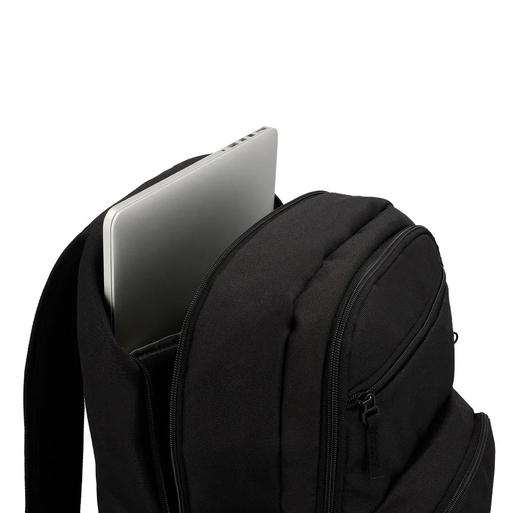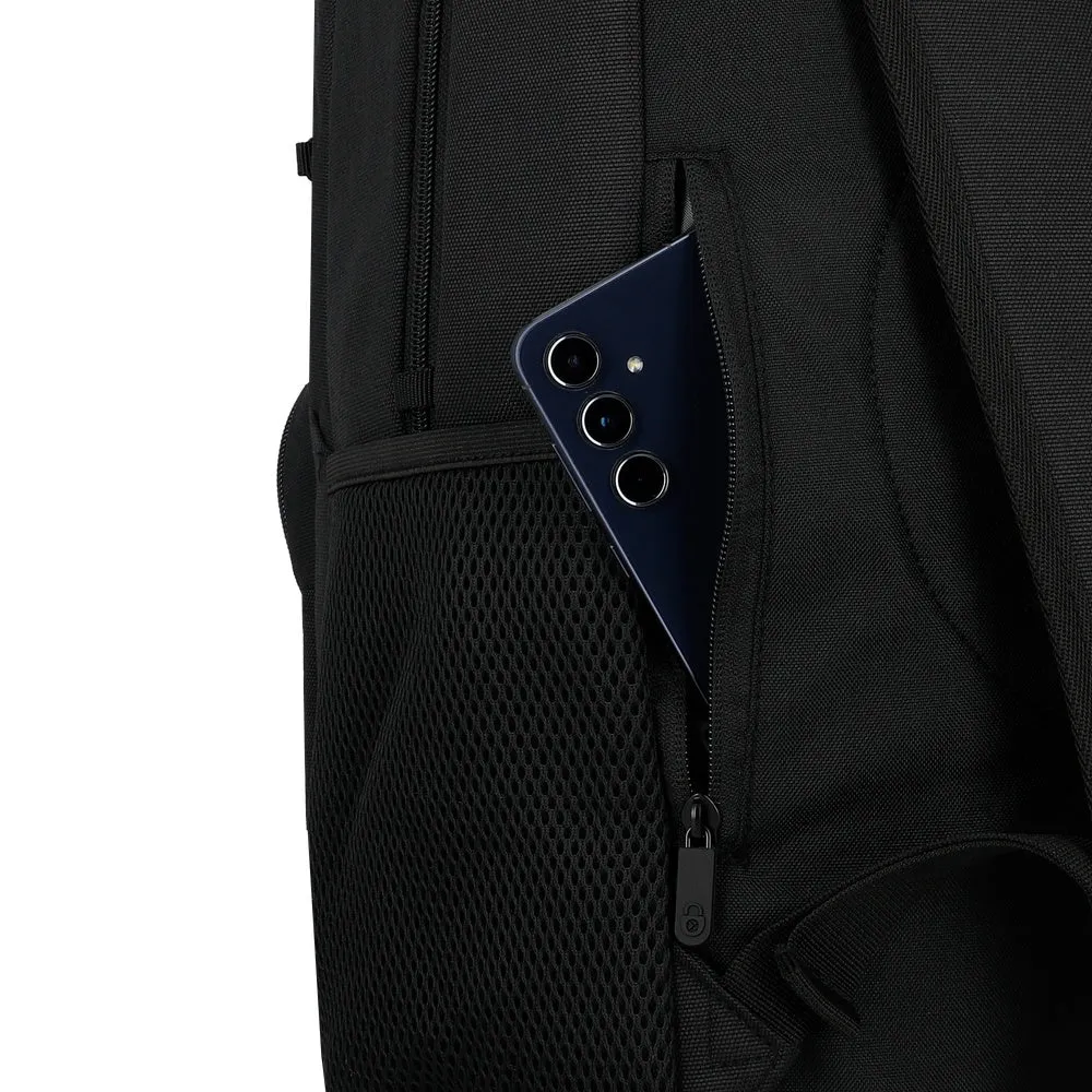 Fabricada en poliéster 100%, cuenta con bolsillos exteriores funcionales y un interior bien organizado. Incorpora compartimento acolchado para notebook de hasta 16 pulgadas y un forro interior fabricado con botellas recicladas, combinando durabilidad y enfoque sustentable.