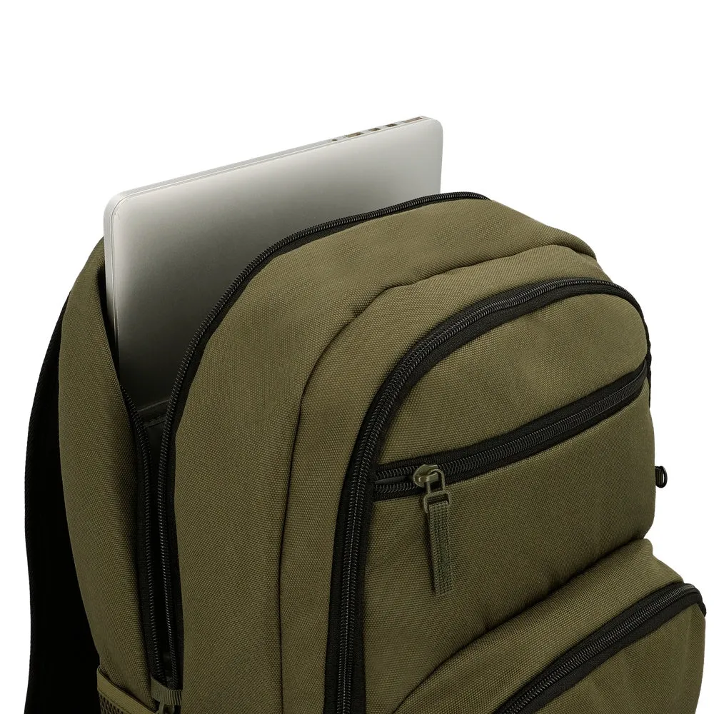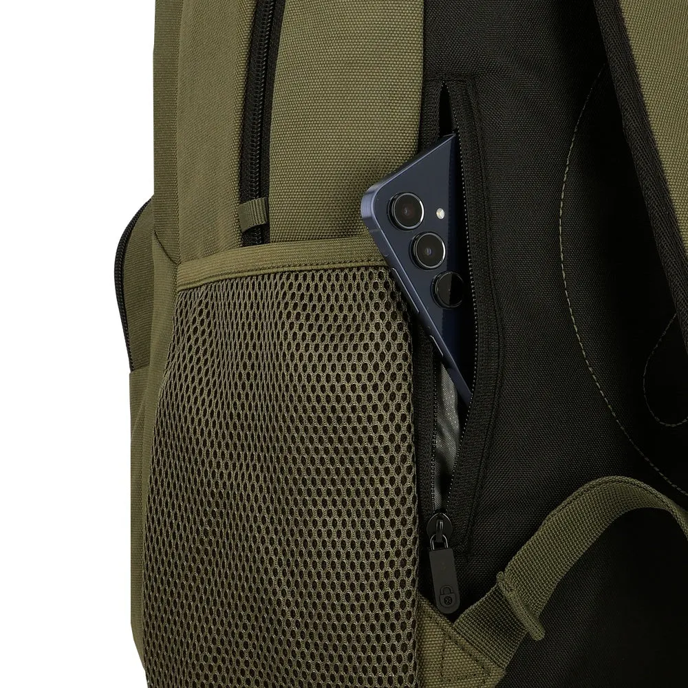 Fabricada en poliéster 100% resistente, incorpora bolsillos exteriores funcionales y detalles pensados para el uso diario. Su interior cuenta con compartimento acolchado para notebook de hasta 16 pulgadas, además de organización interna y un forro confeccionado con botellas recicladas, combinando durabilidad y enfoque sustentable.