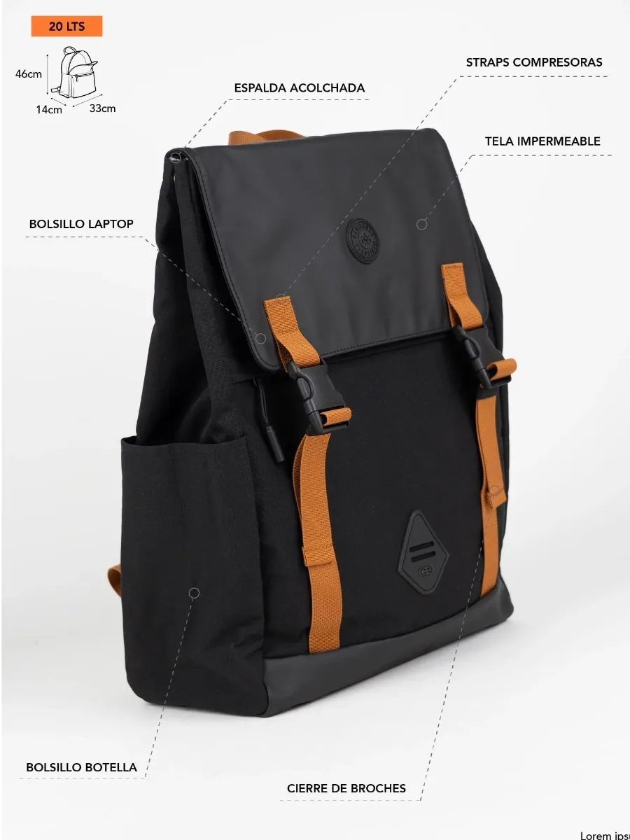 Mochila confeccionada en Polyester + PU, diseñada para ofrecer resistencia, protección y un estilo urbano moderno. Su sistema de cierre con tapa y broches brinda mayor seguridad, mientras que su capacidad permite un uso cómodo tanto para el día a día como para jornadas más largas.