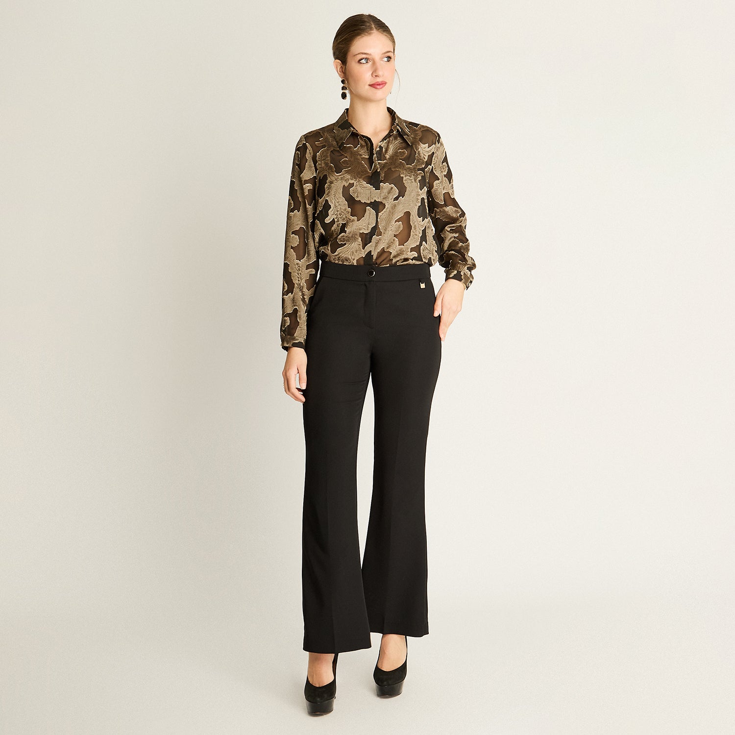 Este pantalón negro de corte flare de la colección Pre Party de Lorenzo di Pontti es una apuesta segura para quienes buscan una silueta estilizada con un toque clásico y moderno a la vez. Su diseño con pierna acampanada le da movimiento a tu outfit y realza la figura sin sacrificar comodidad.