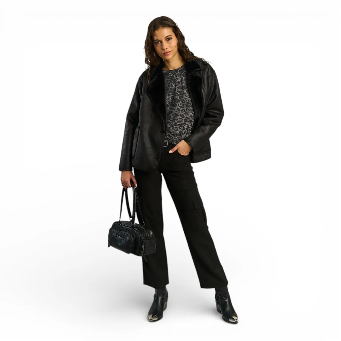 Su calce recto estiliza la silueta y permite una caída limpia, mientras que los bolsillos laterales tipo cargo añaden funcionalidad y carácter. El color negro lo convierte en una prenda versátil, ideal para looks casuales o más pulidos con botines o botas.
