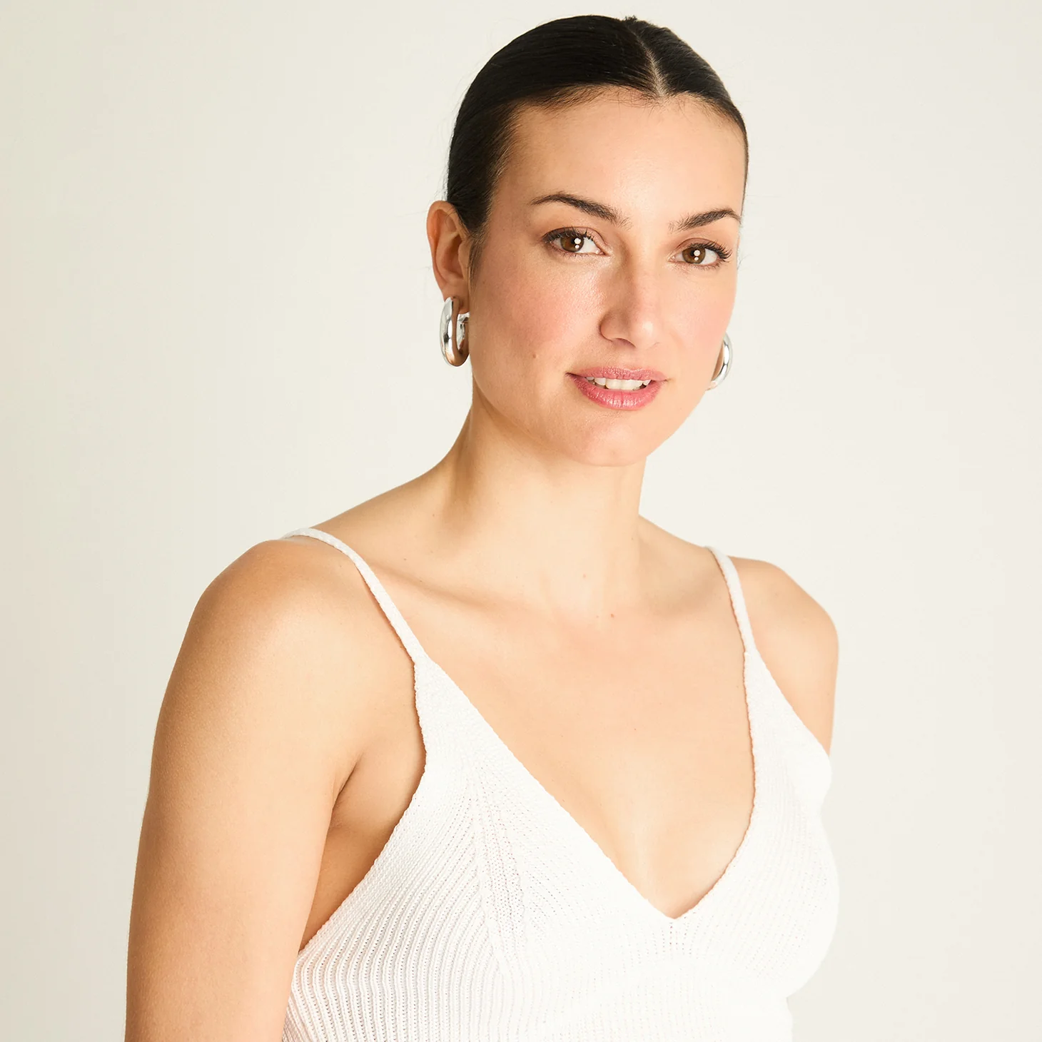 Este top blanco de tirantes finos es un infaltable para los días soleados. Su calce ajustado y confección en viscosa lo hacen fresco y natural al tacto. Ideal para usar con faldas fluidas o pantalones de lino y crear un look con inspiración griega, ligero y elegante