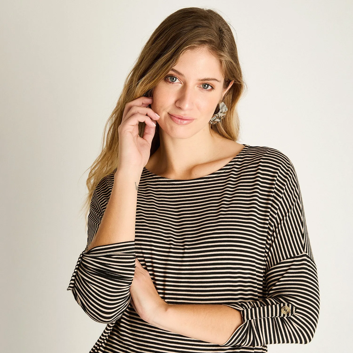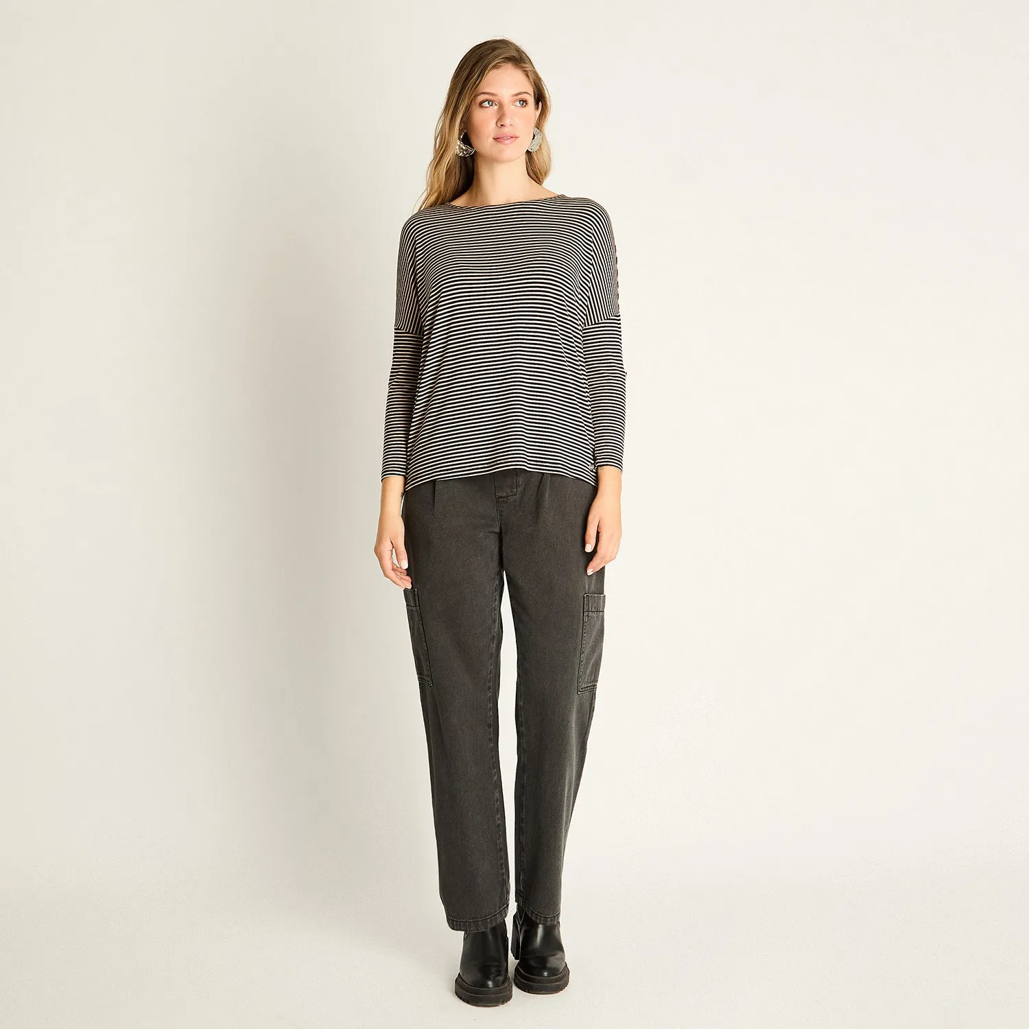 La polera camel con rayas de la colección Básicos de Weekend by Lorenzo di Pontti es una prenda esencial para quienes buscan comodidad sin perder estilo. Su diseño holgado, con manga larga y hombros caídos, ofrece un look relajado perfecto para días de media estación.