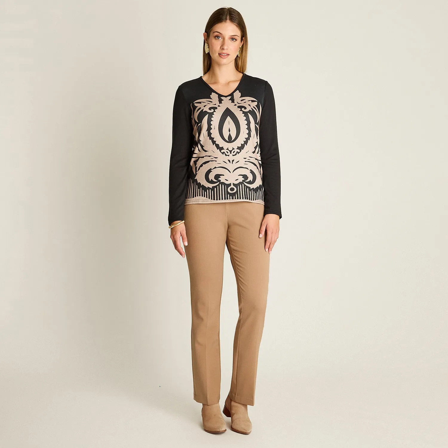 Polera de lanilla en color negro, con estampado frontal y escote en V que realza la silueta. Su diseño de manga larga y confección en tela tipo camant con elasticidad media ofrecen comodidad y abrigo ligero, ideal para looks versátiles de temporada.