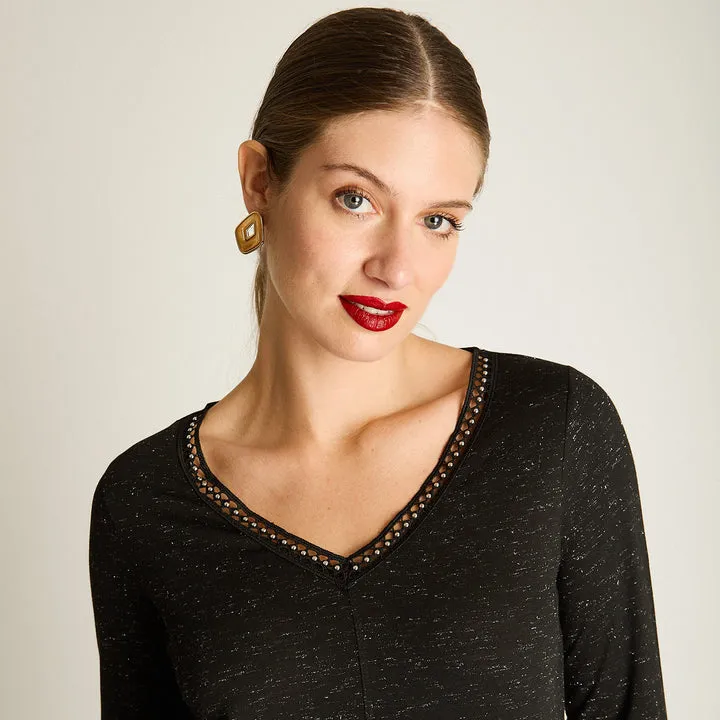 Polera de manga larga en color negro, con cuello en V y aplicaciones sutiles en el escote que aportan un detalle delicado y luminoso. Su tela de punto con lurex ofrece una caída cómoda y versátil, ideal para looks casuales con un acabado más cuidado.