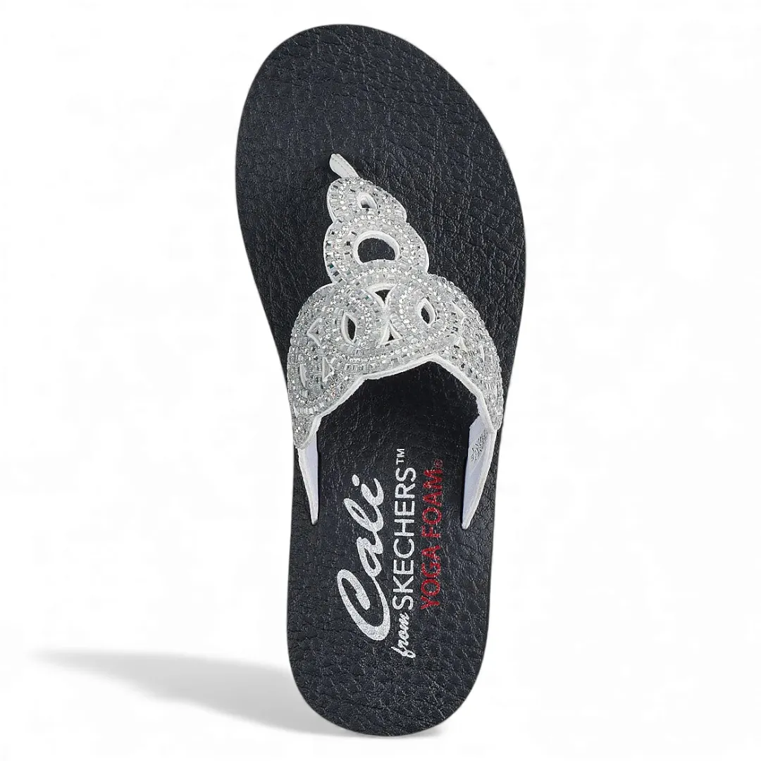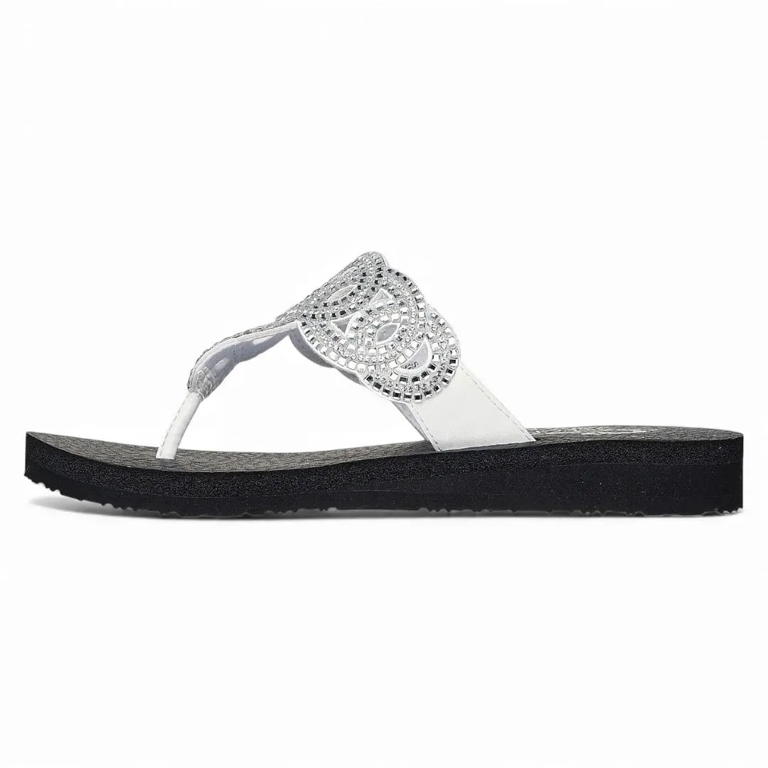 La Skechers Meditation Limitless Glamour destaca por su estilo femenino y su comodidad superior gracias a su plantilla de espuma Yoga Foam, que entrega una pisada suave y acolchada ideal para uso diario. Su diseño con tiras en tono blanco y un adorno calado brillante le otorgan un look delicado y elegante, perfecto para complementar outfits veraniegos o casuales.