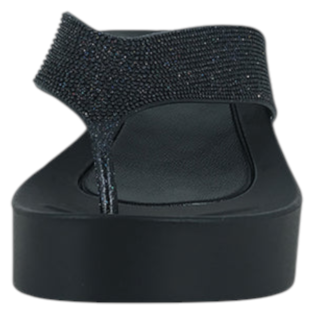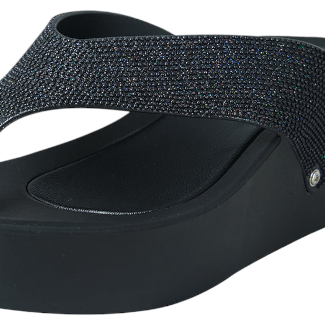 Su diseño tipo plataforma anatómica de 4 cm ofrece una pisada firme y estable, ideal para el uso diario. La capellada con textura brillante y detalles metálicos agrega un toque de elegancia que realza cualquier look casual o playero.