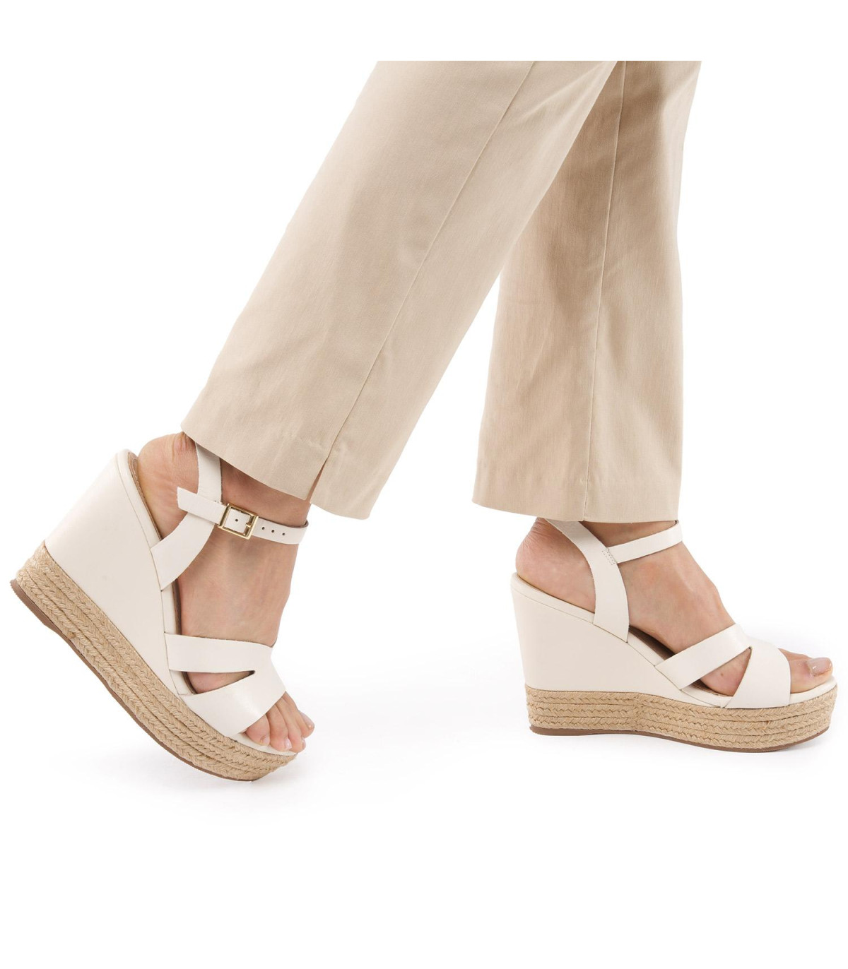 La Sandalia Gilda Off White de Guante destaca por su diseño moderno y femenino, con una plataforma de cuña trenzada y tiras cruzadas de cuero napa que brindan un calce firme y elegante.