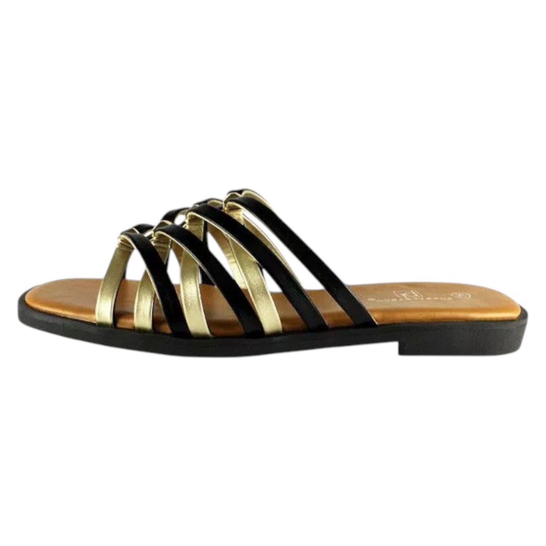 Sandalia de mujer en material sintético color negro con diseño de múltiples tiras entrelazadas en tonos dorado y negro. Ideal para un look veraniego moderno y cómodo. Su plantilla suave brinda confort al caminar, mientras que la suela plana flexible permite un uso diario sin cansancio. Perfecta para combinar con vestidos, jeans o shorts en días de calor.