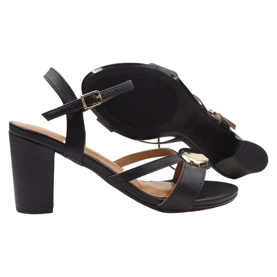Su diseño incluye tiras finas cruzadas y un detalle dorado decorativo sobre la capellada que realza el estilo.