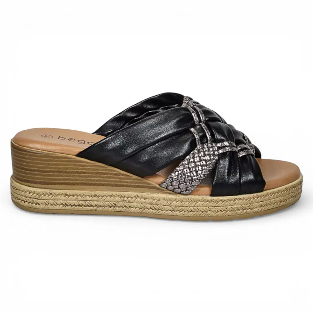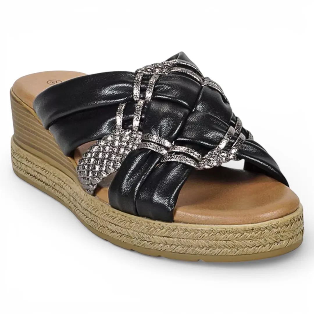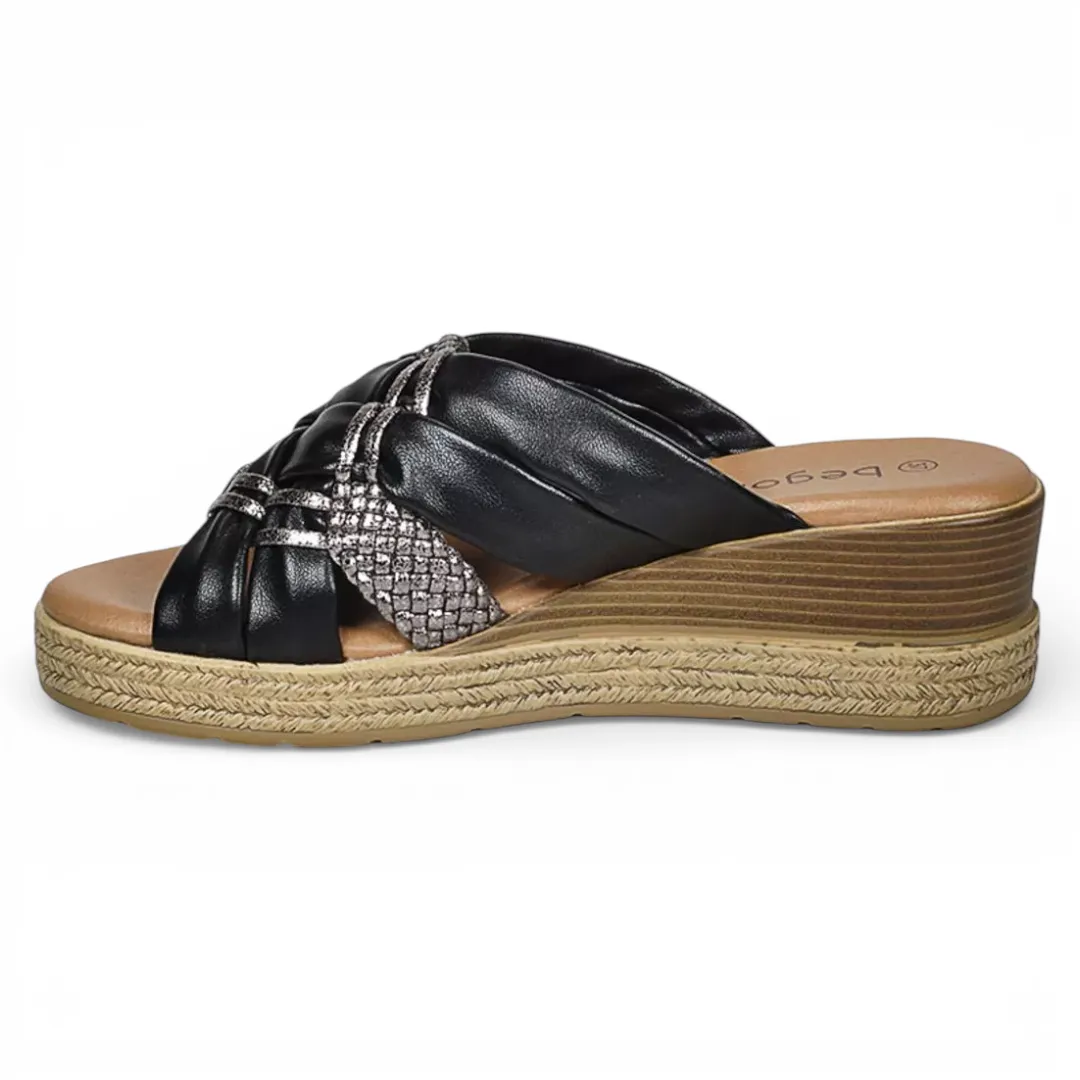 Esta sandalia tipo mule para mujer ofrece comodidad y estilo gracias a su diseño cruzado en material sintético negro, combinado con detalles trenzados que le dan un look moderno y distintivo. Su plataforma baja aporta una leve altura sin sacrificar estabilidad, ideal para caminar durante todo el día.