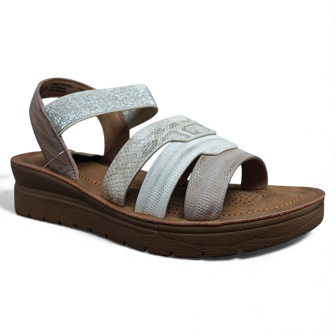 Diseñada con tiras elásticas en tonos beige y champagne, se adapta de forma perfecta al pie, brindando un calce firme y flexible. Su plantilla acolchada tipo Ecoflex Confort ofrece una sensación suave y ergonómica, ideal para largas caminatas o jornadas activas.