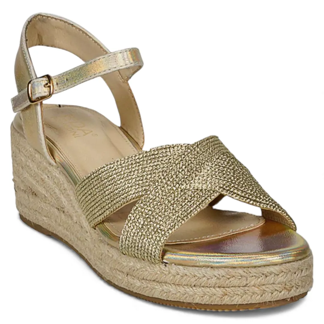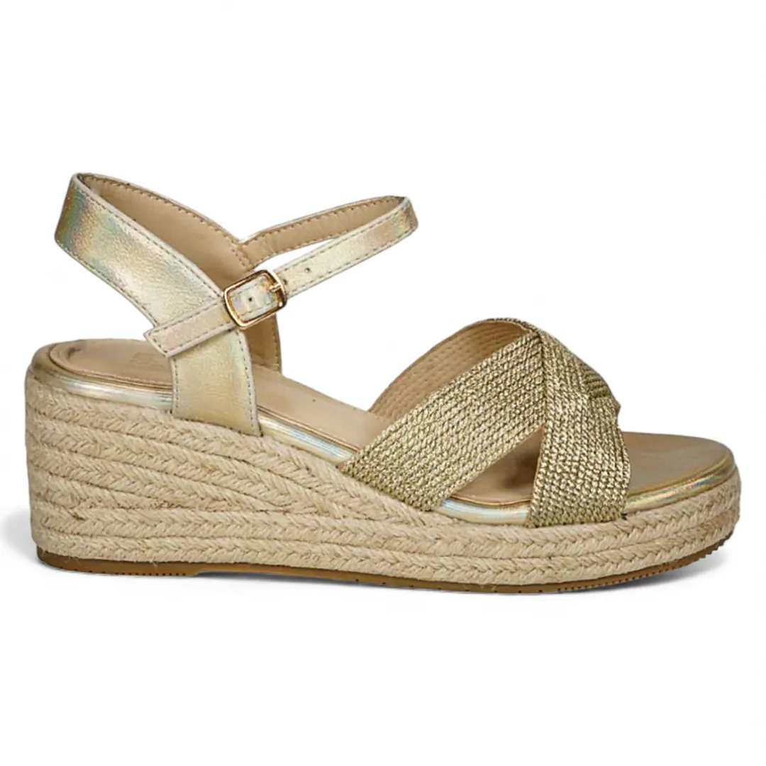 Esta sandalia para mujer destaca por su diseño cruzado en tono dorado, moderno y versátil para looks de verano. Su plataforma cuña de yute ofrece una altura cómoda y estable, ideal para caminar por horas sin perder estilo.