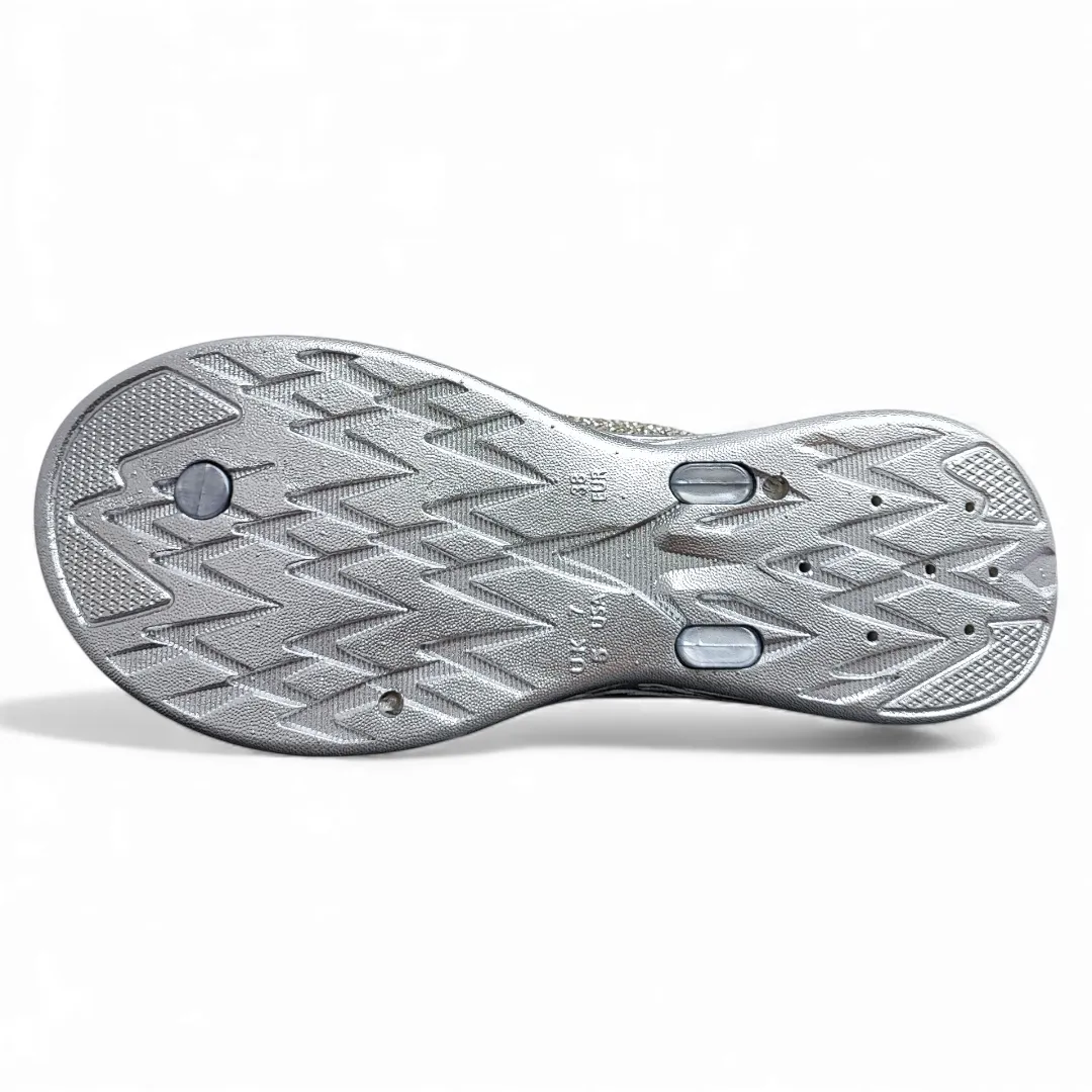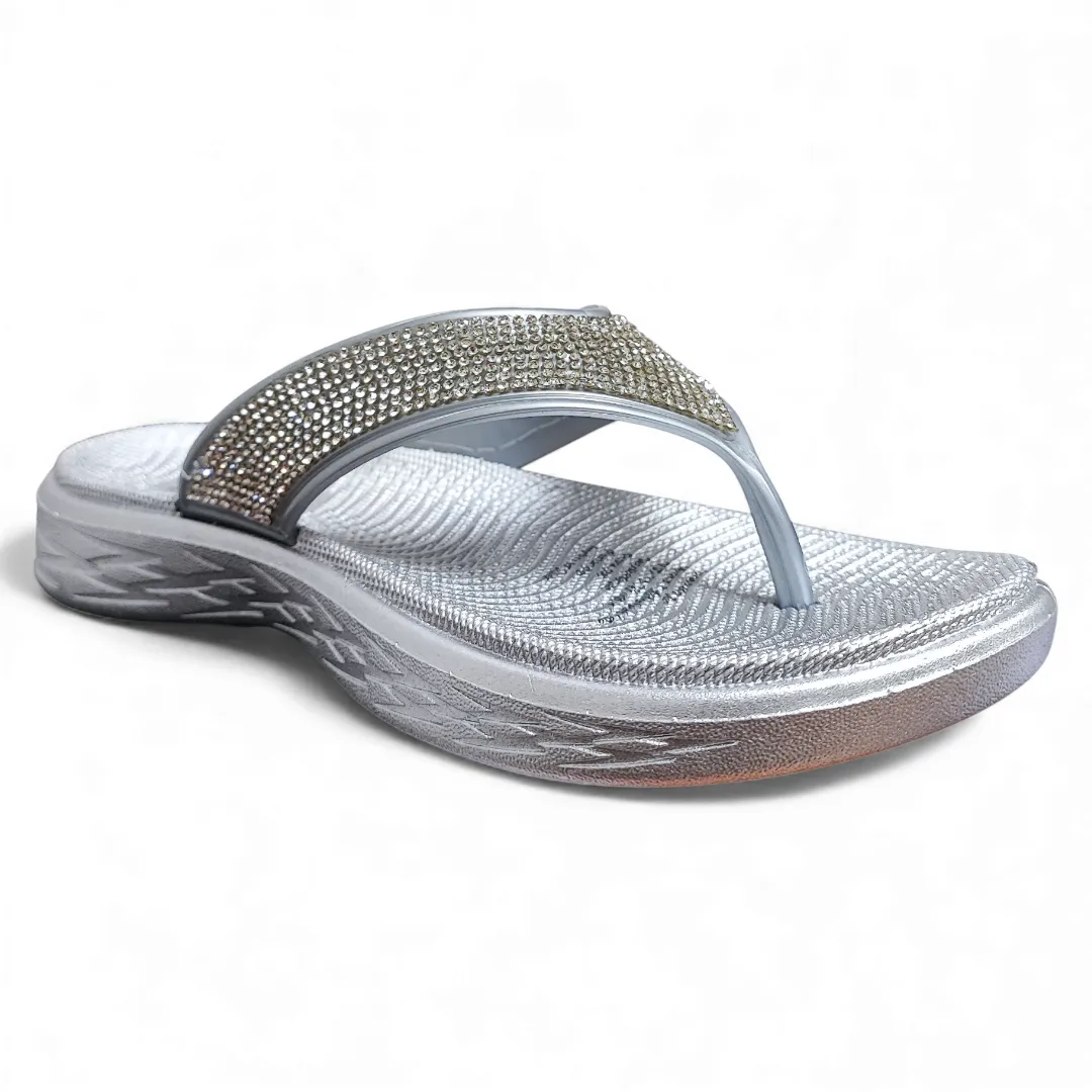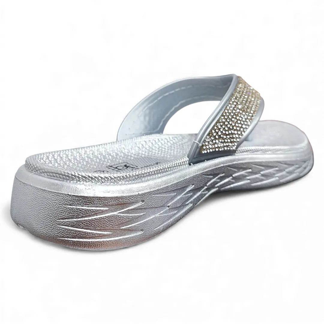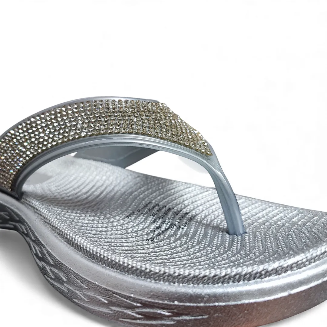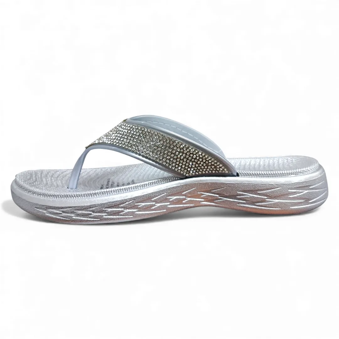 Sandalia tipo hawaiana en color plateado con detalles brillantes que aportan un toque moderno y sofisticado. Su diseño anatómico ofrece gran comodidad al caminar, mientras que la capellada con aplicaciones luminosas realza cualquier look veraniego o casual.