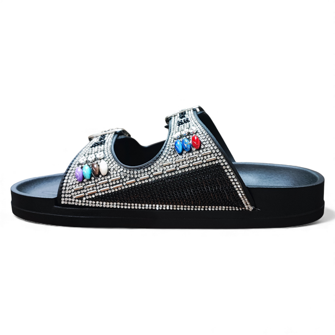 La Sandalia Mujer Diamond Bonny Franco destaca por su diseño moderno y brillante, ideal para quienes buscan comodidad con un estilo llamativo. Su capellada sintética en color Negro incorpora aplicaciones brillantes y doble hebilla ajustable, ofreciendo un calce seguro y adaptable al pie.
