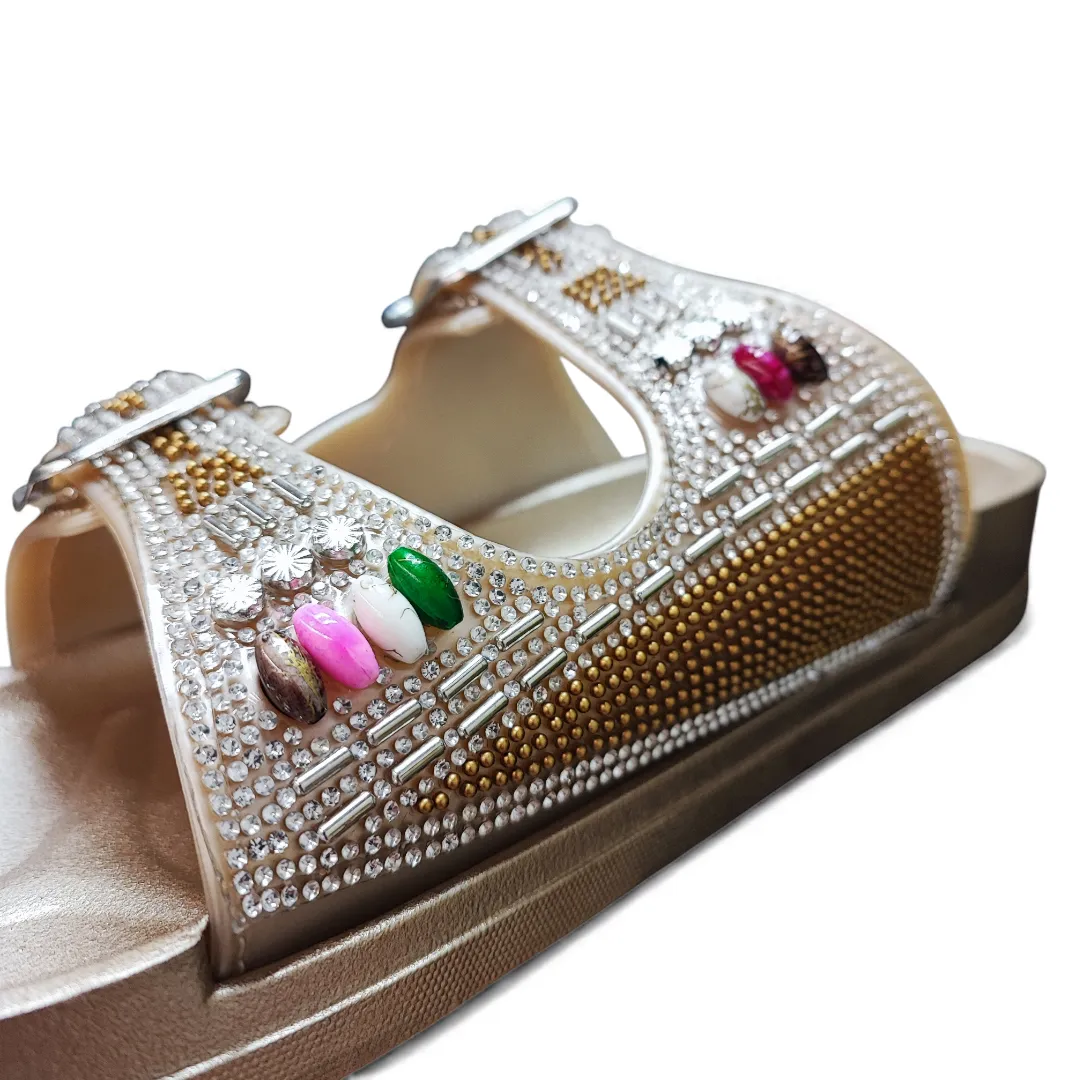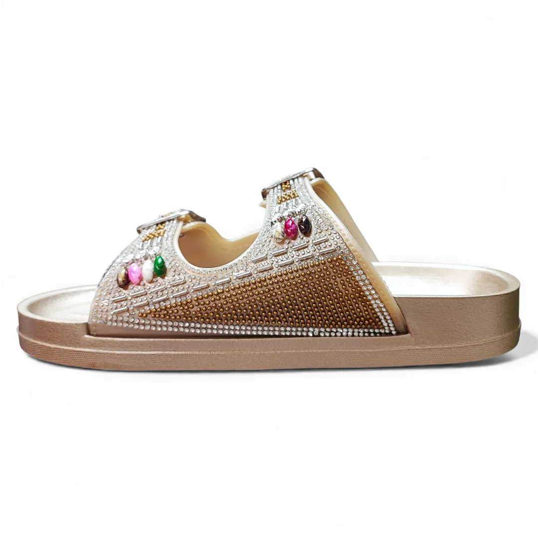 La capellada sintética incorpora dos hebillas ajustables, permitiendo un calce adaptable que abraza el pie con seguridad. El diseño con aplicaciones brillantes aporta un toque elegante y femenino, convirtiéndola en una sandalia versátil para cualquier ocasión.