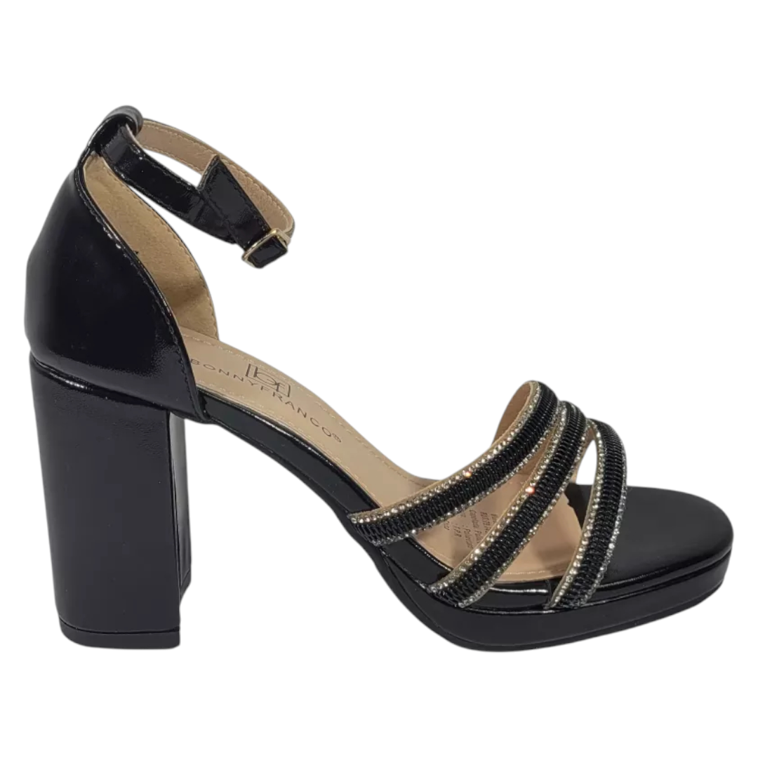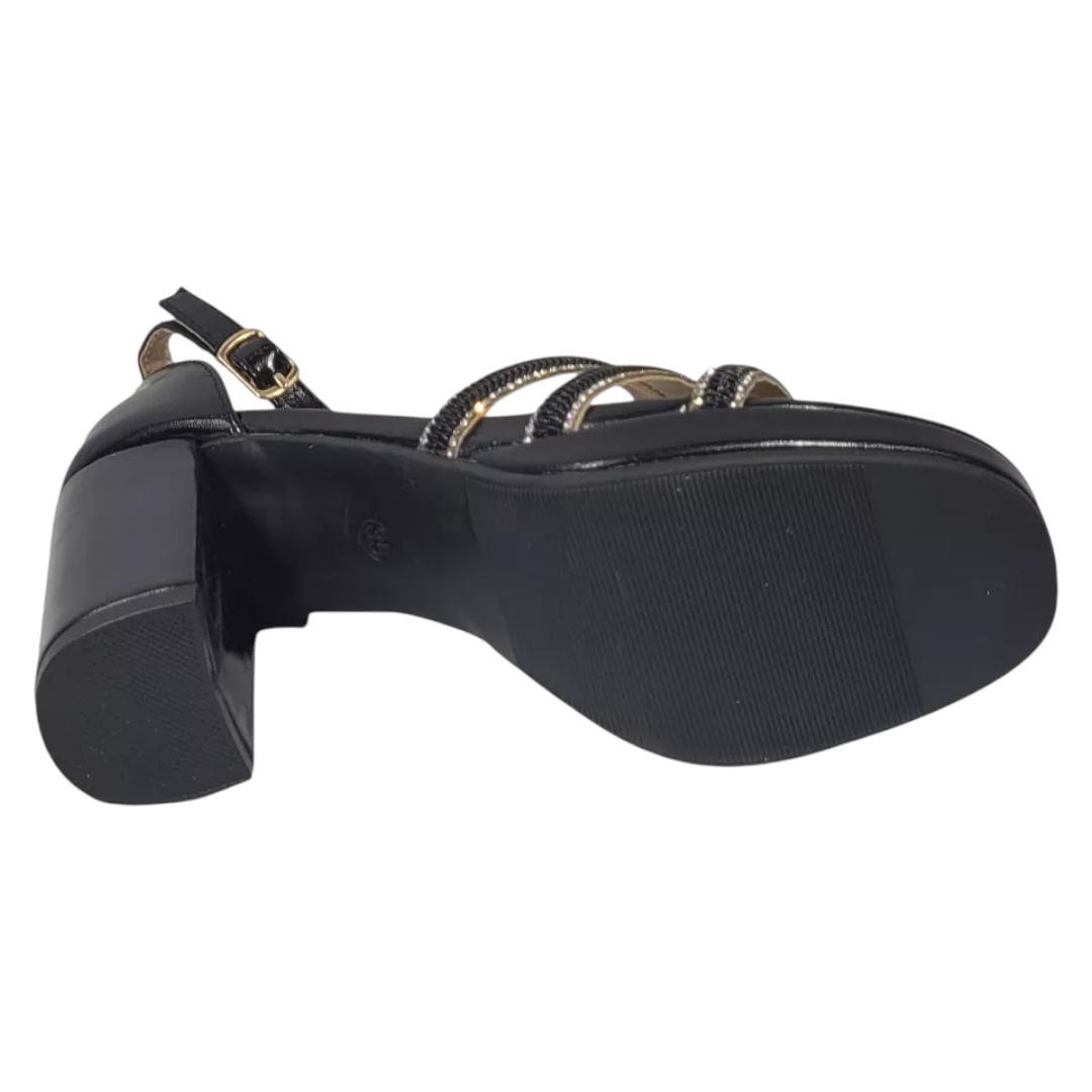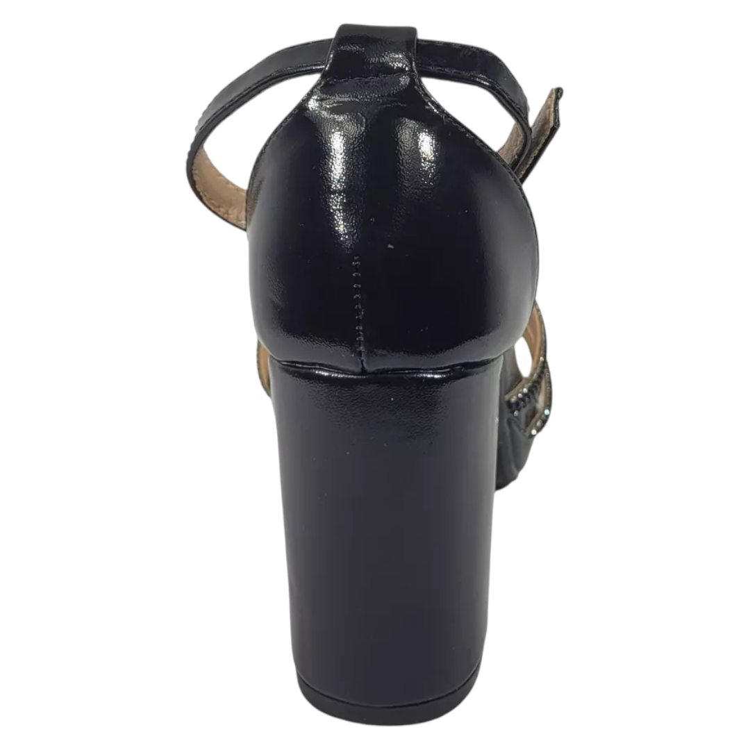 Sandalia de mujer con diseño elegante y acabado brillante en color negro. Sus tiras frontales con detalles decorativos añaden un toque moderno y sofisticado, ideal para fiestas o eventos formales. Incluye cierre con hebilla ajustable al tobillo que garantiza una buena sujeción. El tacón alto cuadrado con ligera plataforma brinda estabilidad y comodidad al caminar.