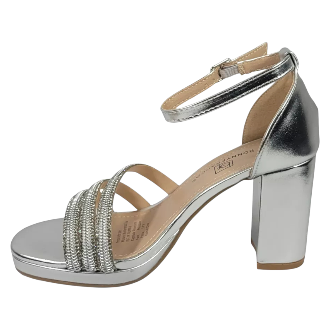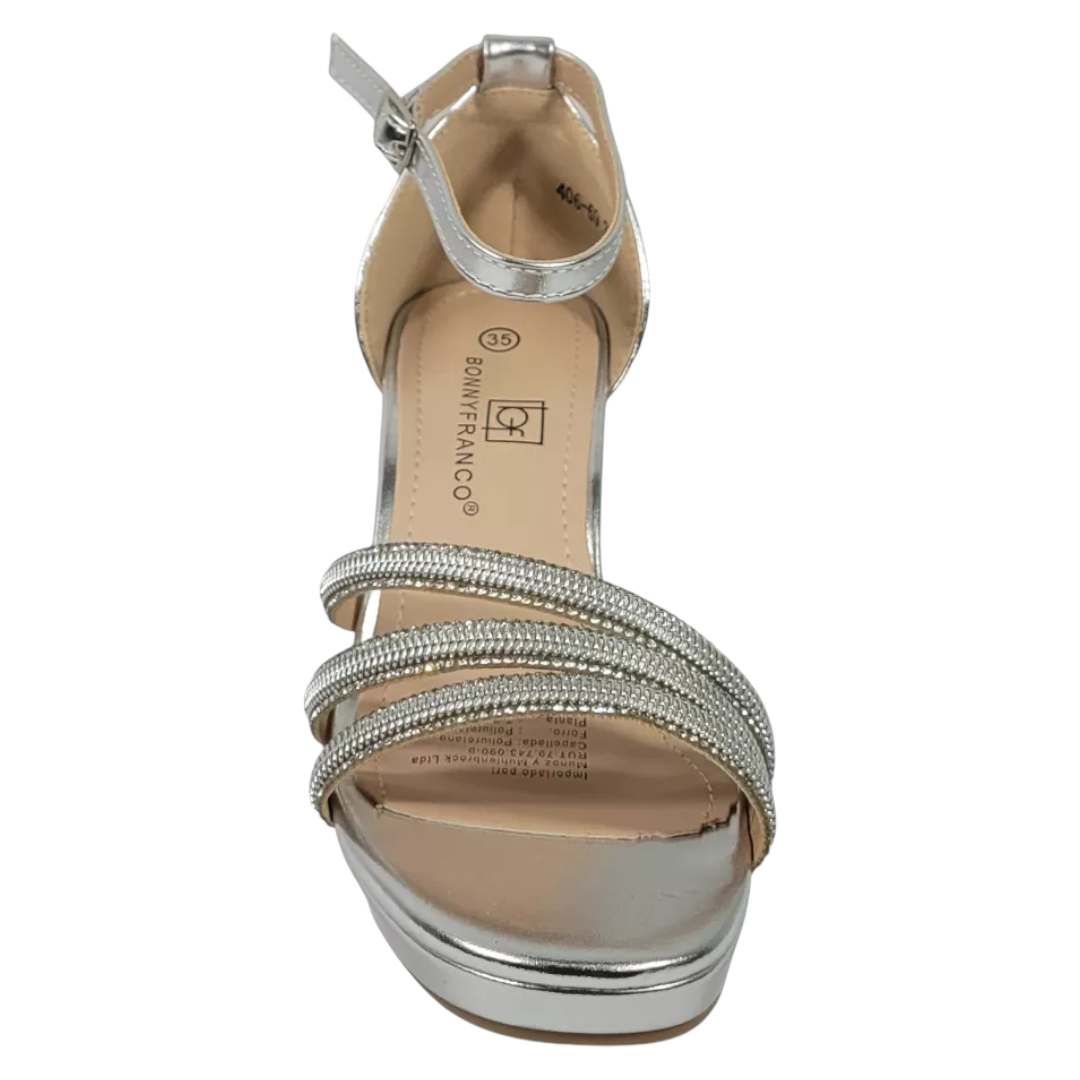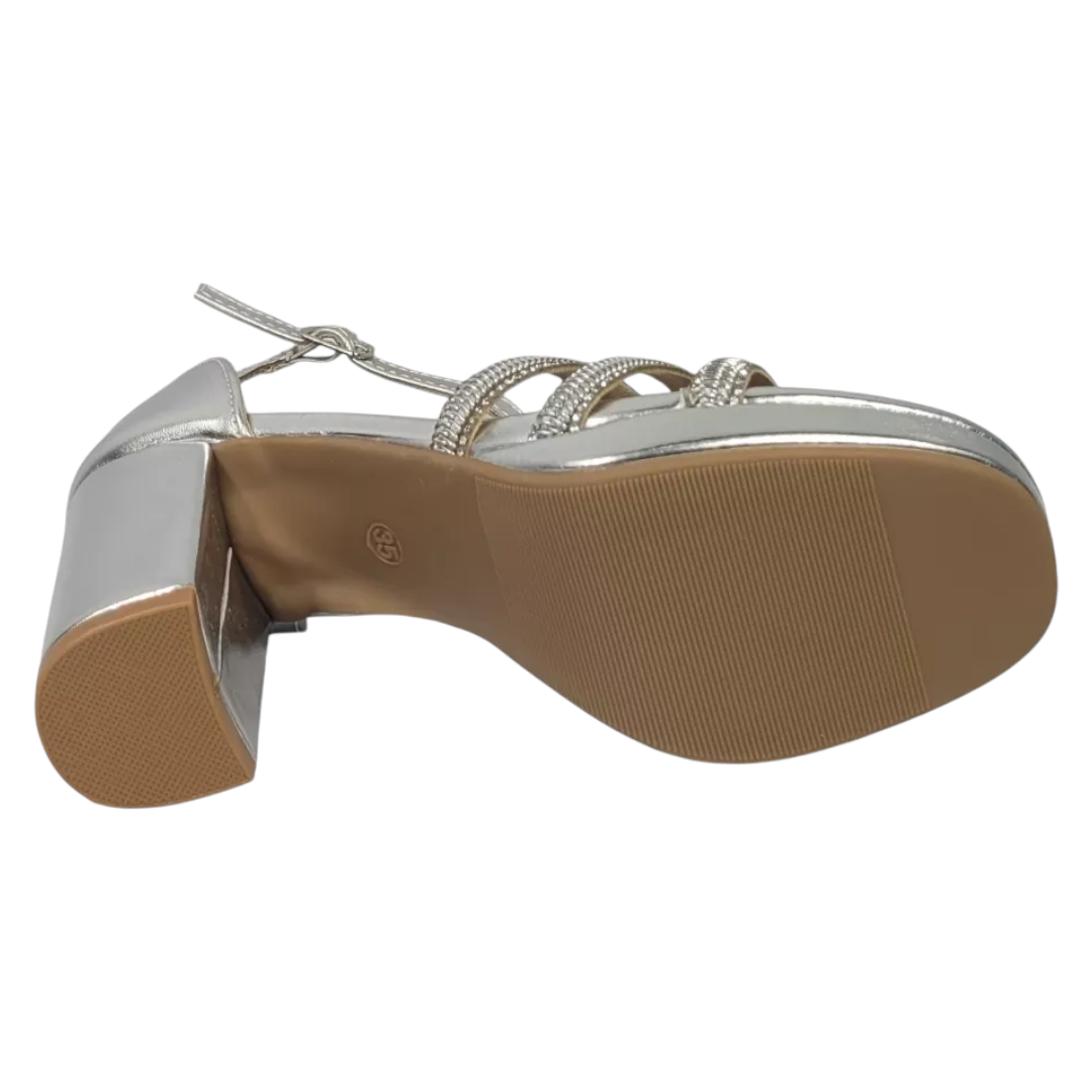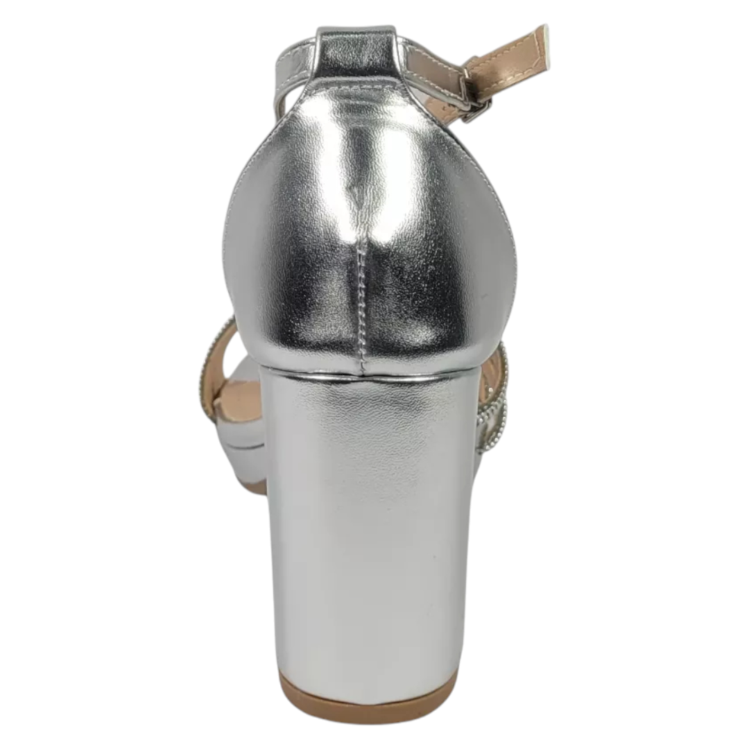 Sandalia de mujer con diseño elegante y acabado metalizado en tono plateado. Ideal para eventos de noche, fiestas o celebraciones especiales. Sus tiras frontales con detalle brillante realzan el estilo, mientras que el cierre con hebilla ajustable proporciona un calce firme y cómodo. El tacón alto cuadrado y la ligera plataforma frontal entregan una excelente estabilidad al caminar.