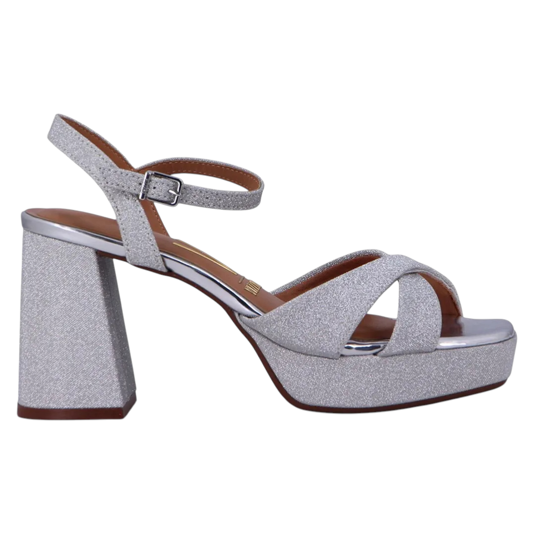 Sandalia Mujer Taco Alto Tela Shine París Metal Glamour Plata Vizzano
