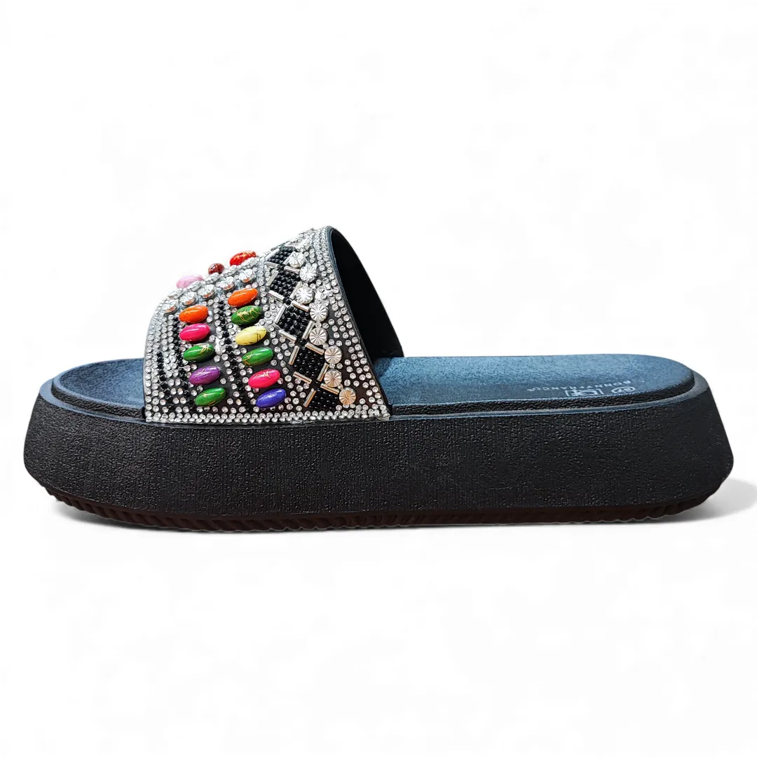 Atrévete a destacar con la Sandalia Plataforma Mujer Sintético Negro con Piedras Bonnyfranco, una propuesta moderna que combina comodidad y estilo único. Su diseño cuenta con una capellada decorada con piedras de colores y detalles brillantes, que aportan un toque artesanal y elegante. La base de plataforma alta en color negro brinda estabilidad y una pisada cómoda, ideal para looks urbanos o de verano.