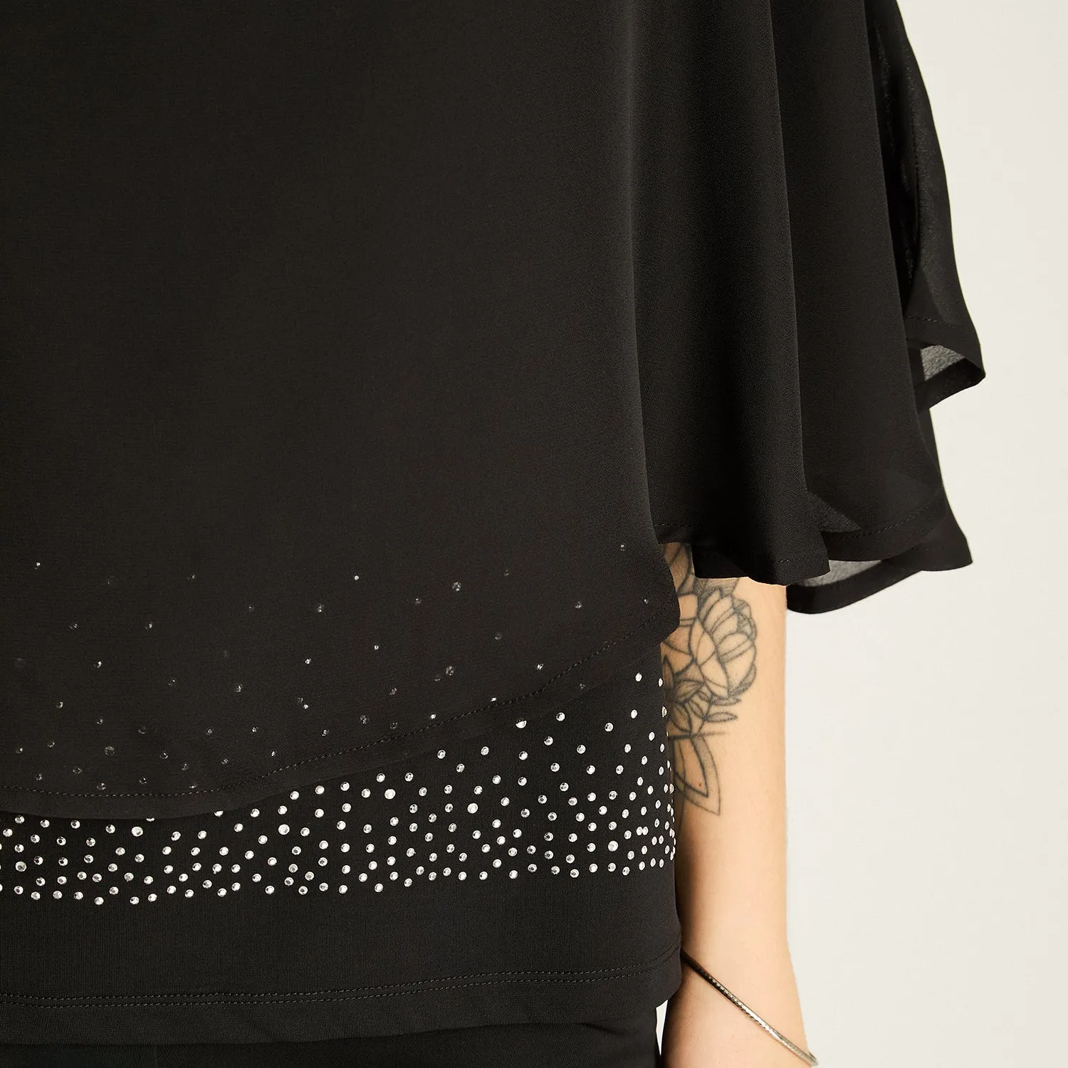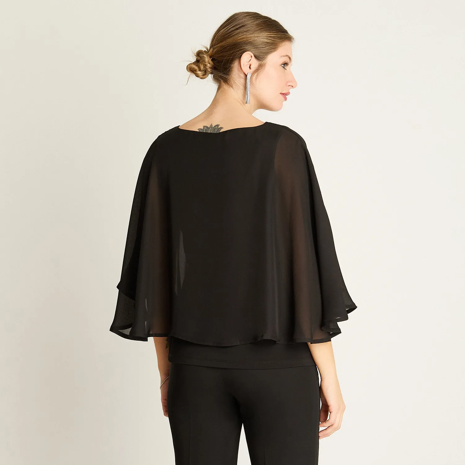 La túnica negra de la colección Pre Party de Lorenzo di Pontti es la elección perfecta para quienes buscan destacar con sutileza y comodidad. Su diseño de doble capa fluida con efecto envolvente y un delicado terminado con brillos en la parte inferior la convierten en una prenda elegante, moderna y femenina.