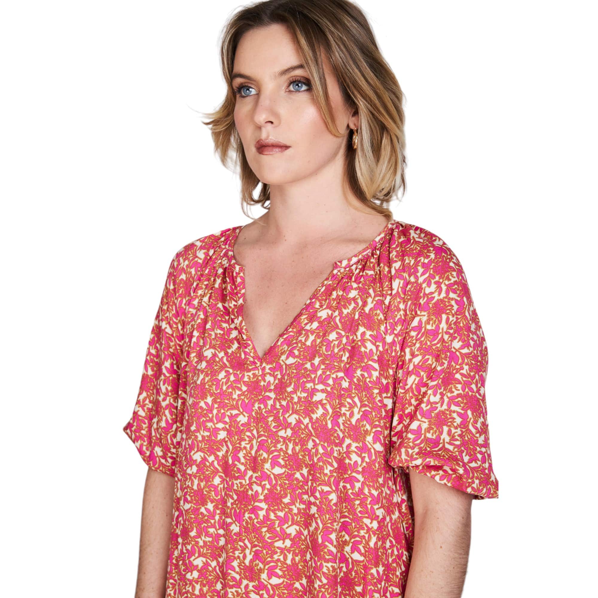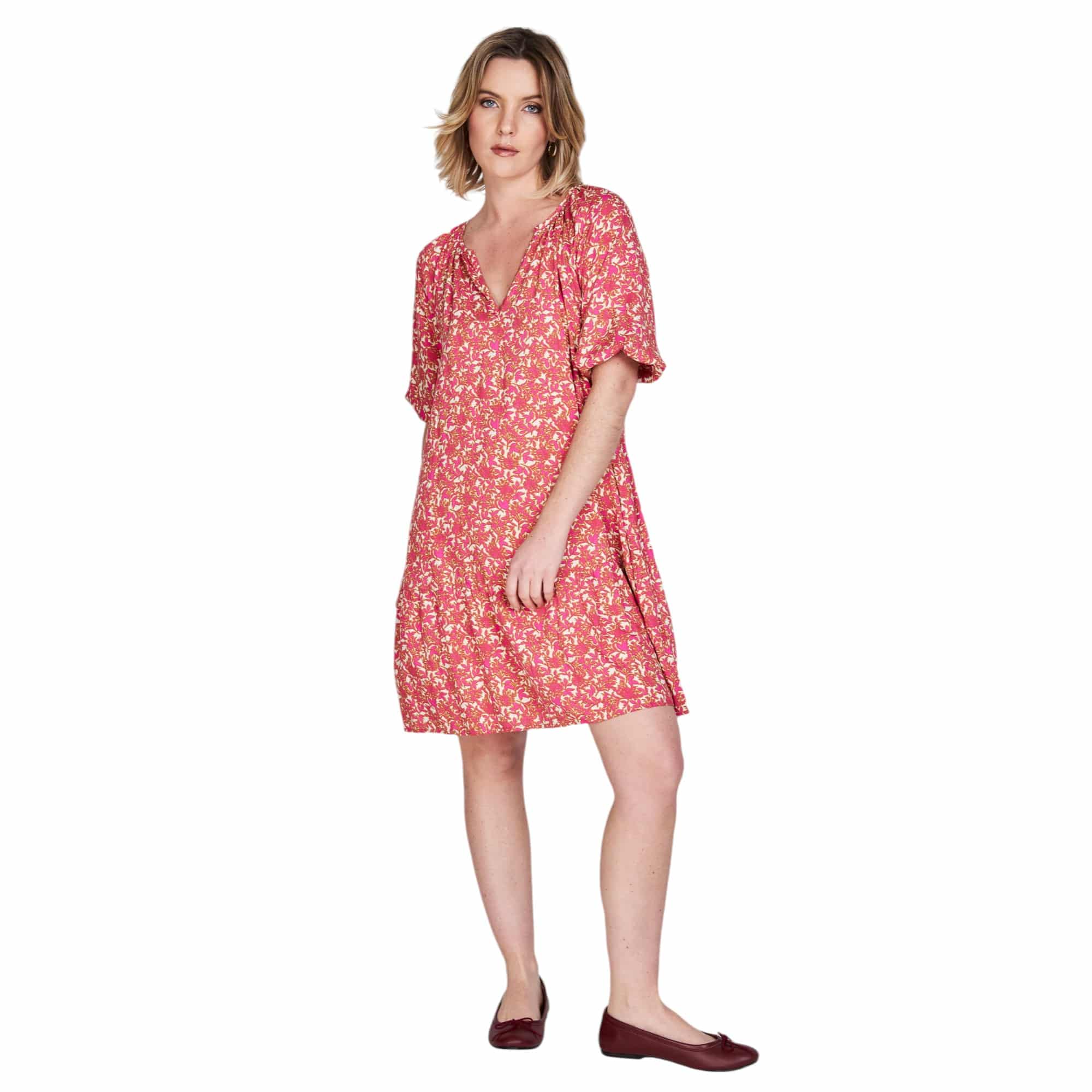 El Vestido Mara viene en una tela fresca y con calce holgado Tiene un elastico al final de las mangas que genera un efecto de manga globo.