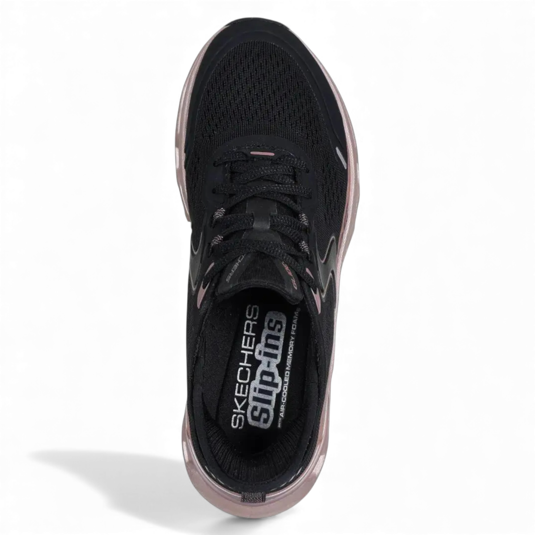 Las Skechers Slip Ins Glide Step Altus en color negro con detalles rose gold combinan un estilo moderno con comodidad inmediata. Su diseño Slip Ins permite calzarlas sin usar las manos, entregando un ajuste práctico y seguro. La capellada de malla técnica proporciona ligereza y ventilación constante, adaptándose al movimiento natural del pie durante caminatas o uso diario.