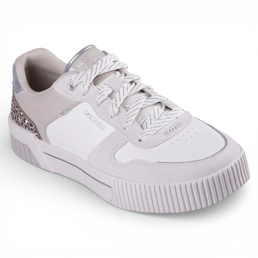 Disfruta de una comodidad purrrfectamente estilizada en la cancha con Skechers Jade – Lustrous Luxury. Este zapato bajo con cordones presenta una parte superior de duraleather y superposiciones de gamuza con un talón con estampado de leopardo, detalle metálico de bigote y una plantilla acolchada Skechers Air-Cooled Memory Foam® para mayor confort.