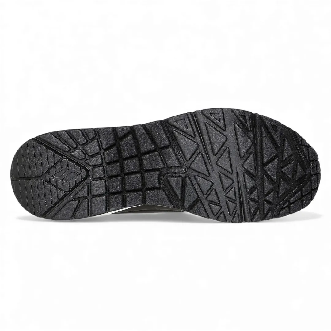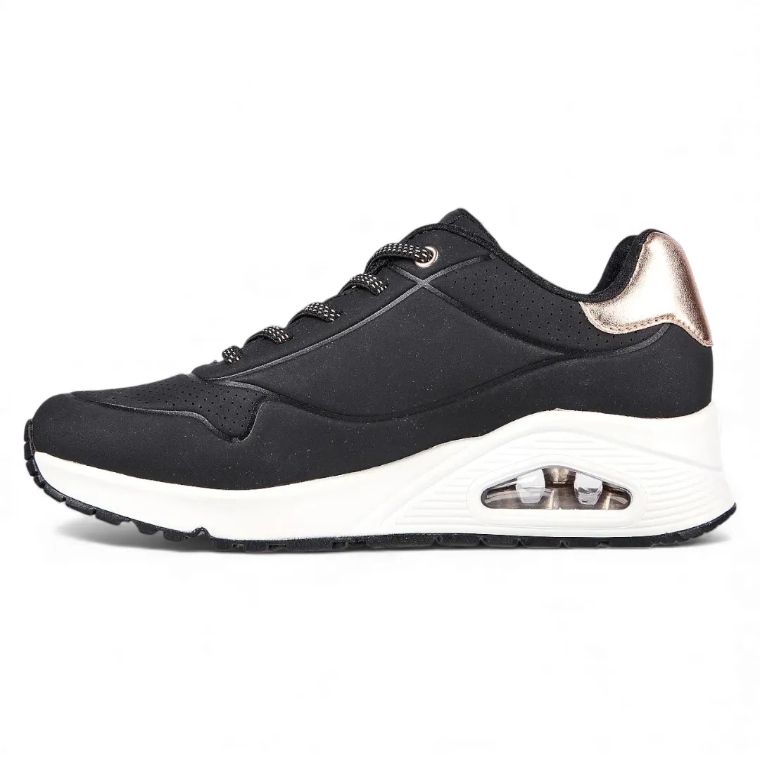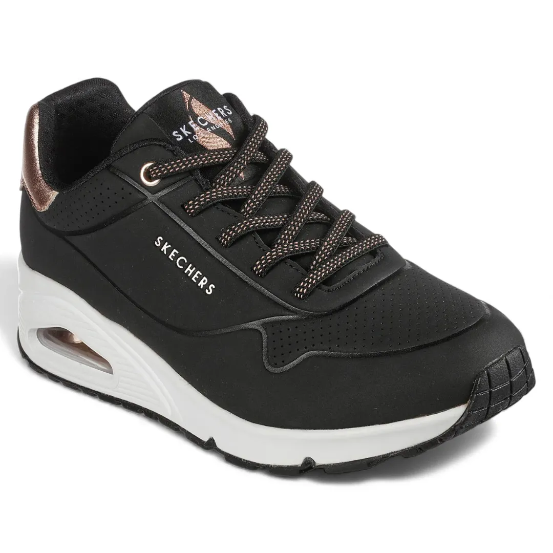 Disfruta de un estilo clásico con la comodidad de la Skechers Street® Uno – Shimmer Away. Esta moderna zapatilla presenta una parte superior de durabuck sintético y con un ribete metálico, cordones elásticos, plantilla Skechers Air-Cooled Memory Foam® y media suela visible Skech-Air® con cámara de aire.