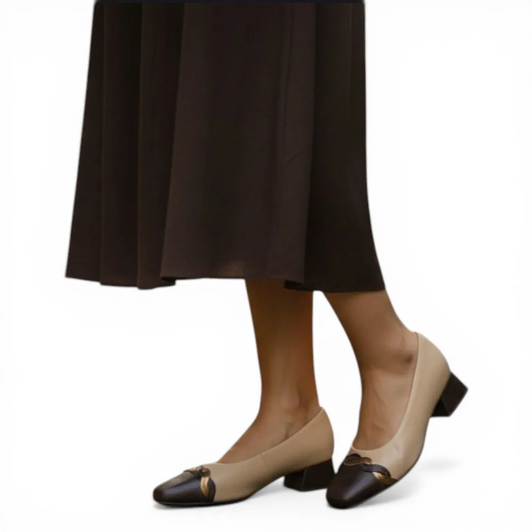 Zapato Piccadilly para mujer diseñado para uso diario y ocasiones formales. Su combinación de tonos beige y café tipo Brule permite complementar distintos estilos de vestimenta.