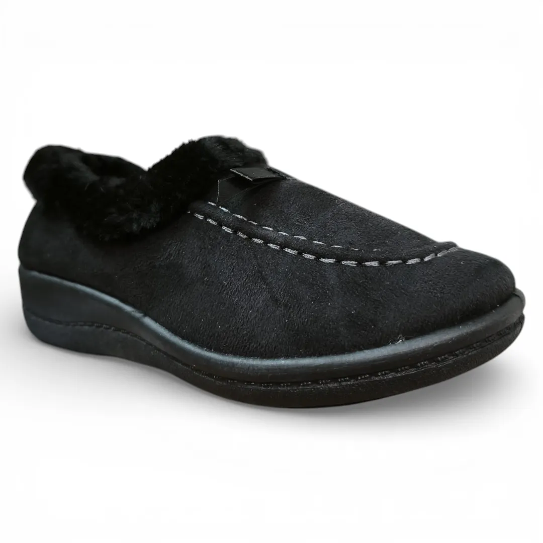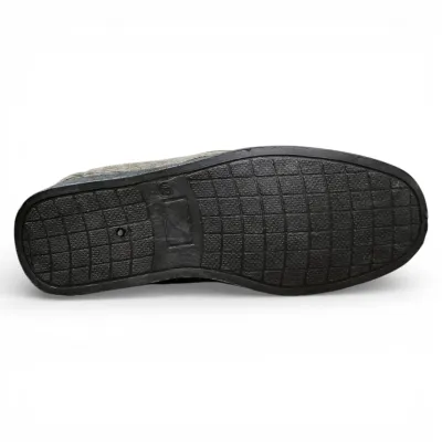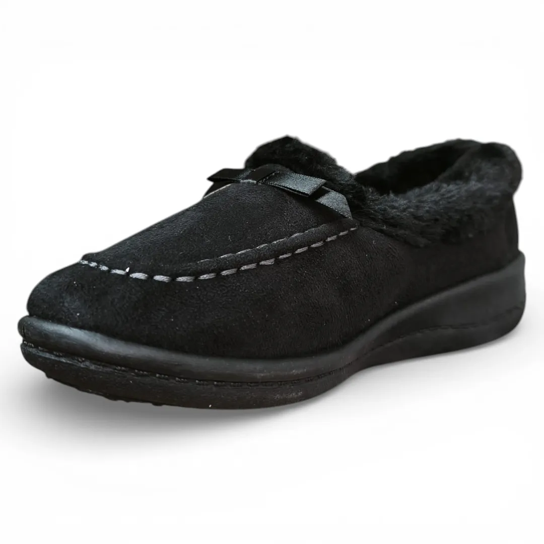 Su interior con chiporro suave mantiene los pies cálidos y confortables, mientras que su diseño tipo mocasín permite un calce fácil y práctico. El exterior presenta un acabado elegante y discreto que se adapta perfectamente a momentos de descanso y relajación.