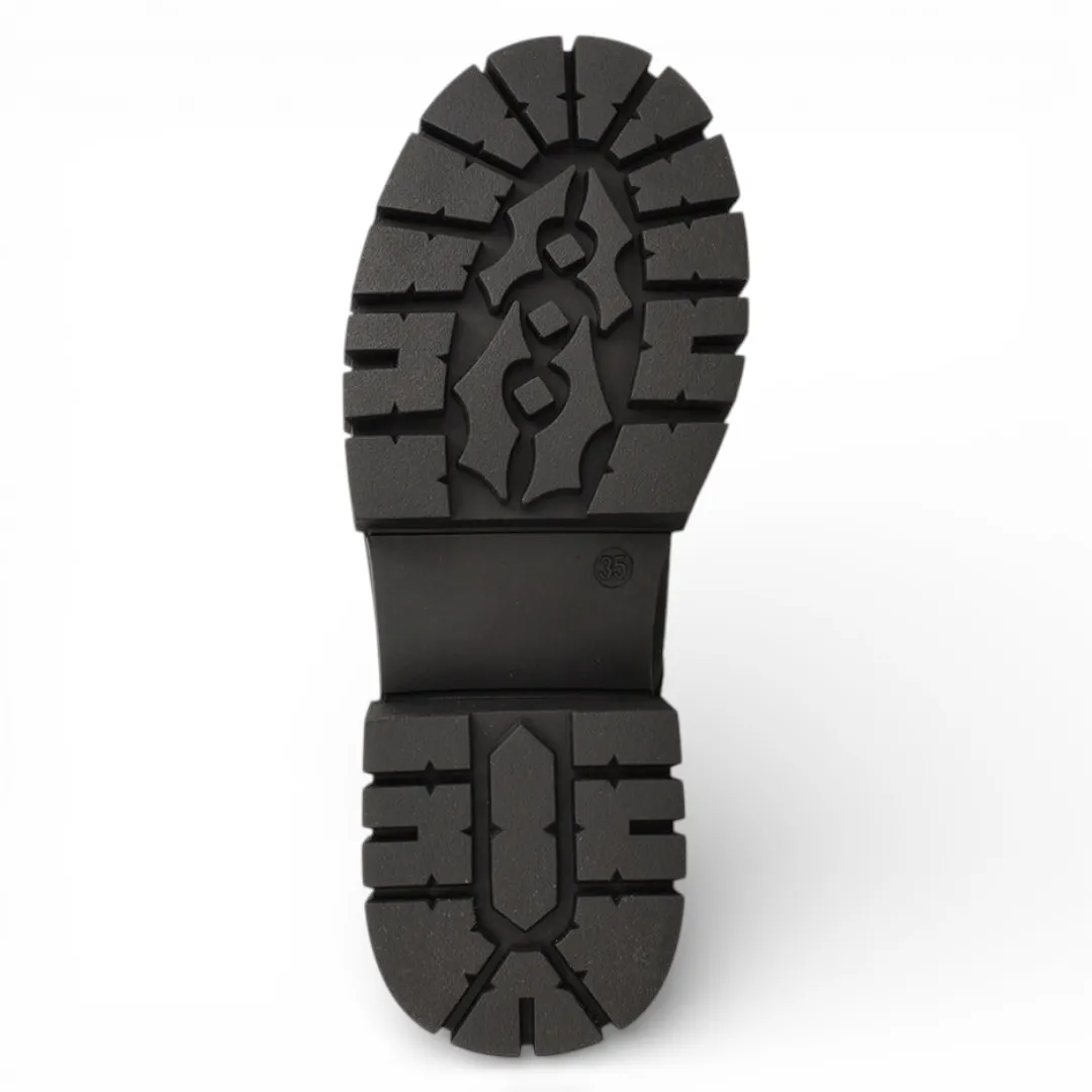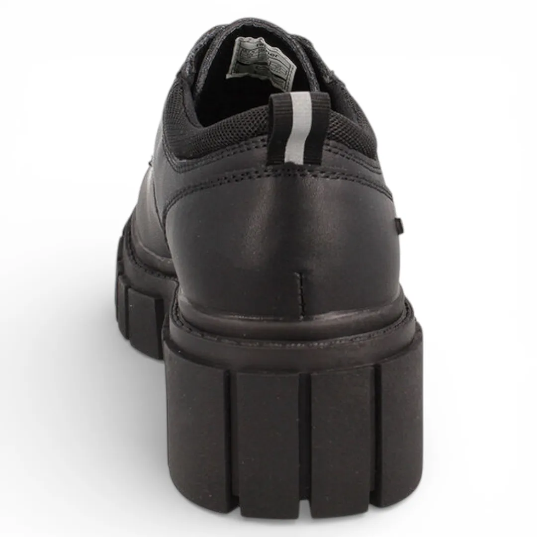 El modelo Chumy destaca por su diseño sobrio en color negro y su plataforma firme, que entrega estabilidad y una pisada segura durante toda la jornada. Su material sintético de alta calidad es resistente y fácil de limpiar, ideal para el uso escolar continuo. El ajuste con cordones permite un calce firme y cómodo.