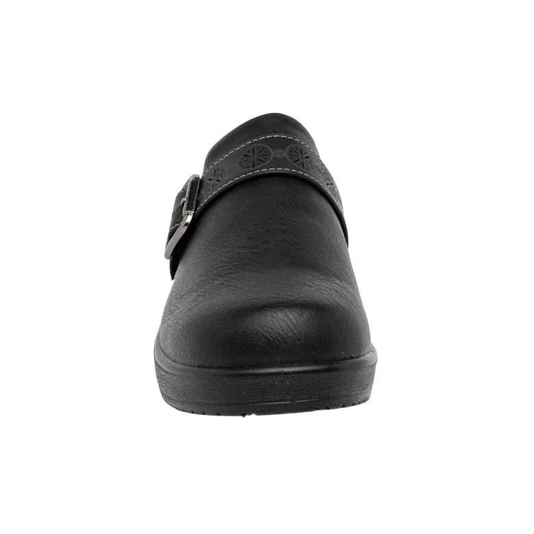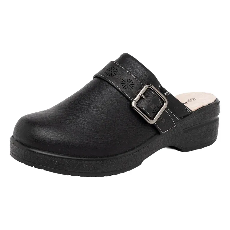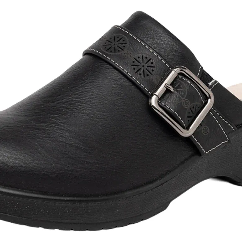 Incorpora correa superior con hebilla ajustable para un mejor ajuste al pie y una estructura cerrada que entrega mayor soporte. Su plataforma liviana aporta estabilidad y una pisada cómoda, mientras el color negro combina fácilmente con distintos estilos y uniformes.